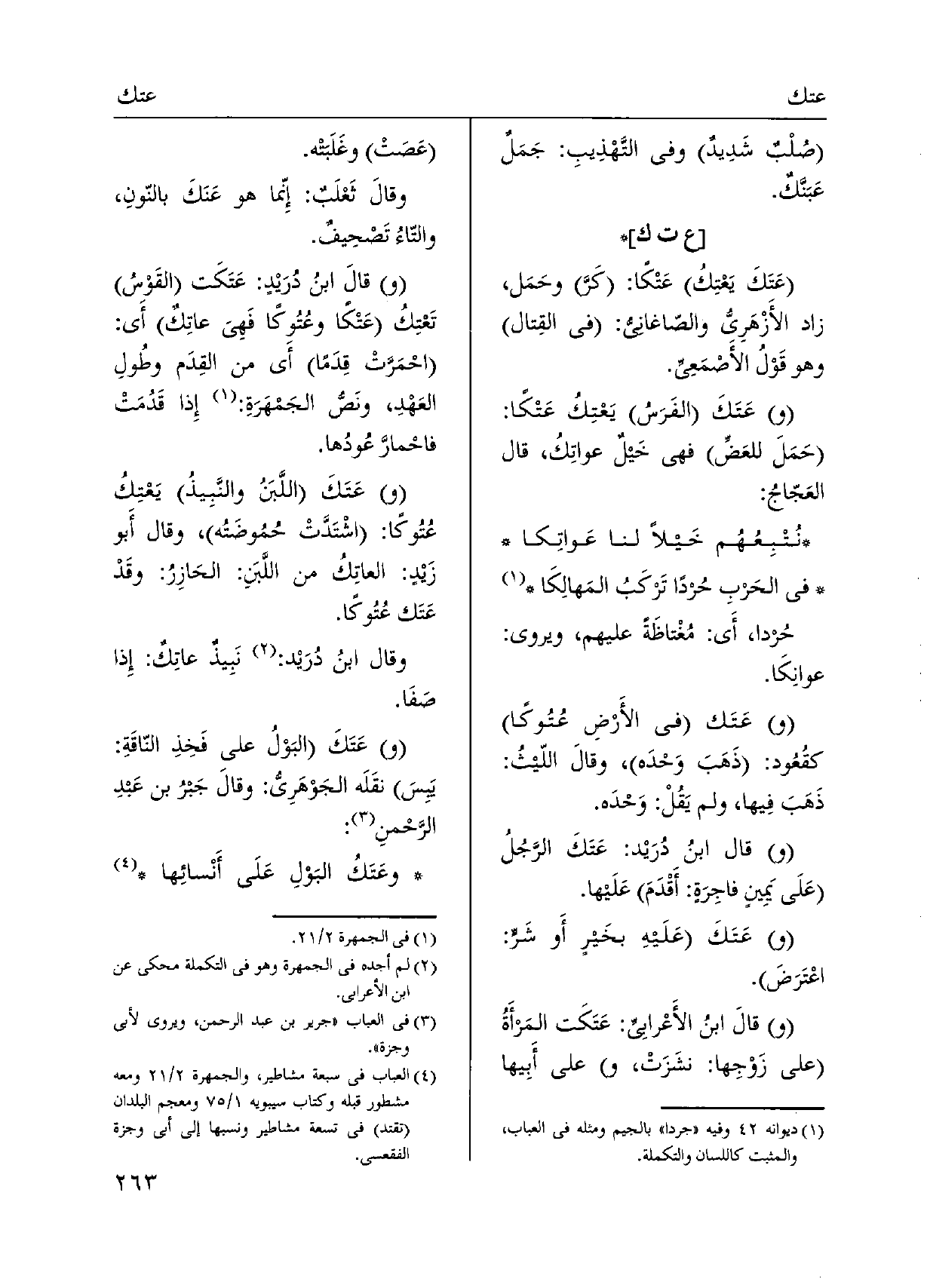 وقالَ ابنُ الأَعْرابِي: عَتَكَت المَرأَةُ على زَوْجِها: نشَزَتْ، وعَلى أَبِيها عَصَتْ وغَلَبتْه. وقالَ ثَعْلَبٌ: إِنّما هُوَ عَنَكَ بالنّونِ، والتّاءُ تَصْحِيفٌ. وقالَ ابنُ دُرَيْدٍ: عَتَكَت القَوْسُ تَعْتِكُ عَتْكًا وعُتُوكًا فَهي عاتِكٌ أَي: احْمَرَّتْ قِدَمًا أَي من القِدَم وطُولِ العَهْدِ، ونَصُّ الجَمْهَرَةِ: إِذا قَدُمَتْ فاحْمارَّ عُودُها. وعَتَكَ اللَّبن والنَّبِيذُ يَعْتِكُ عُتُوكًا: اشْتَدَّتْ حُمُوضَتُه، وَقَالَ أَبو زَيْدٍ: العاتِكُ من اللَّبَنِ: الحَازِرُ: وقَدْ عَتَك عُتُوكًا. وَقَالَ ابنُ دُرَيْد: نَبِيذٌ عاتِكٌ: إِذا صَفَا. وعَتَكَ البَوْلُ على فَخِذِ النّاقَةِ: يَبِسَ نقَلَه الجَوْهَرِيُّ: وقالَ جَبرُ بن عَبدِ الرَحْمنِ: وعَتَكُ البَوْلِ عَلَى أَنْسائِها