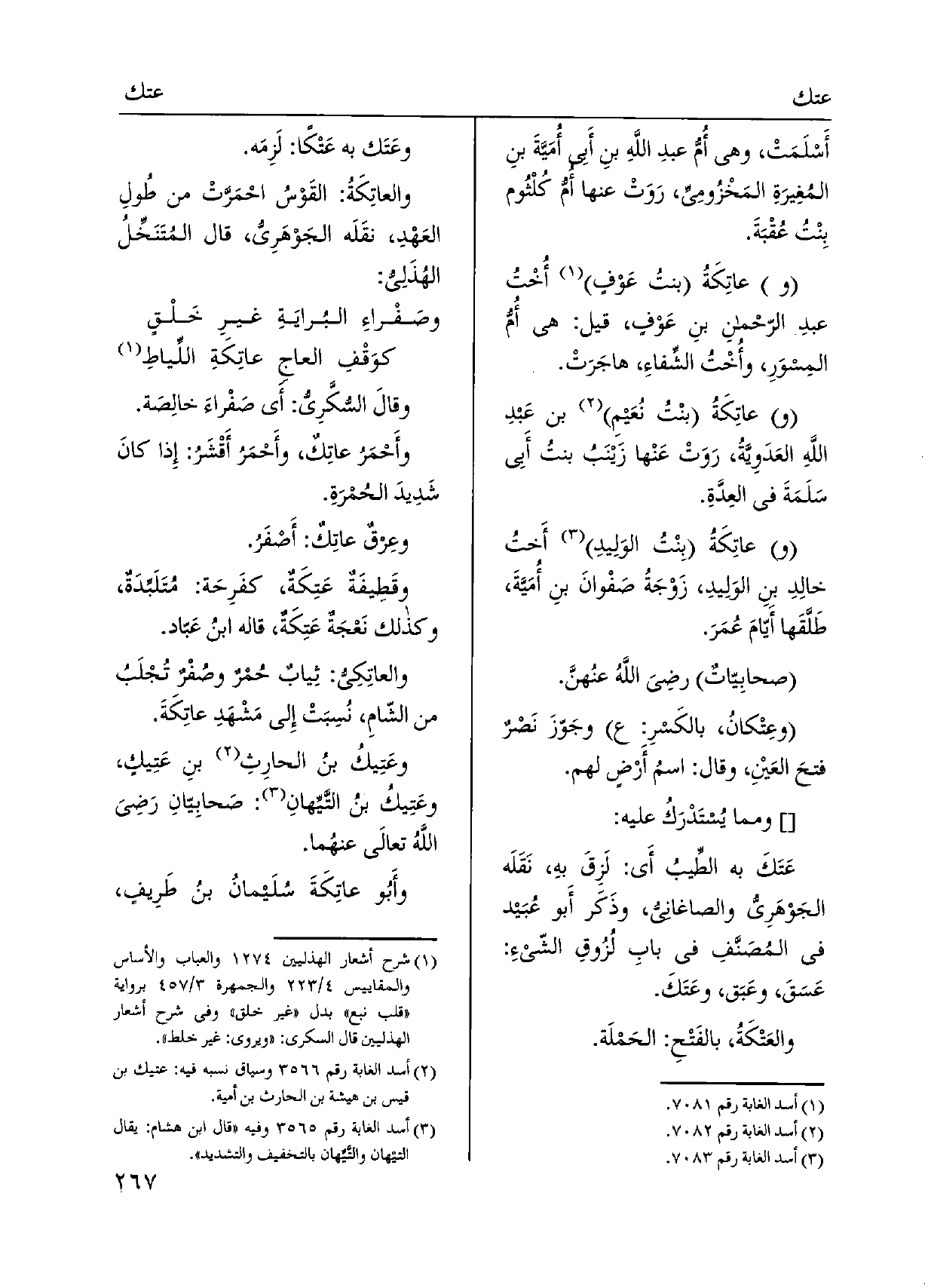 أَسْلَمَتْ، وَهِي أُمُّ عبدِ اللَّهِ بنِ أَبِي أُمًيّةَ بنِ المُغِيرَةِ المَخْزُومِيِّ، رَوَتْ عَنْهَا أمُّ كُلْثُوم بنت عُقْبَةَ. وعاتِكَةُ بنتُ عَوْفٍ أُخْتُ عبدِ الرّحْمنِ بنِ عَوْفٍ، قيل: هِيَ أمُّ المِسوَرِ، وأُخْتُ الشِّفاءِ، هاجَرَتْ. وعاتِكَةُ بنْتُ نُعَيمِ بن عَبدِ اللَّهِ العَدَوِيَّةُ، رَوَتْ عَنْها زَيْنَبُ بنت أبي سَلَمَةَ فِي العِدَّةِ. وعاتِكَةُ بِنْتُ الوَلِيدِ أَختُ خالِدِ بنِ الوَلِيدِ، زَوْجَةُ صَفْوانَ بنِ أمَيَّةَ، طَلَّقَها أَيّامَ عُمَرَ. صحابِيّاتٌ رَضِي اللَّهُ عنُهنَّ. عِتْكانُ، بالكَسرِ: وجَوّزَ نَصْرٌ فتحَ العَين، وَقَالَ: اسمُ أَرْضٍ لَهُم.