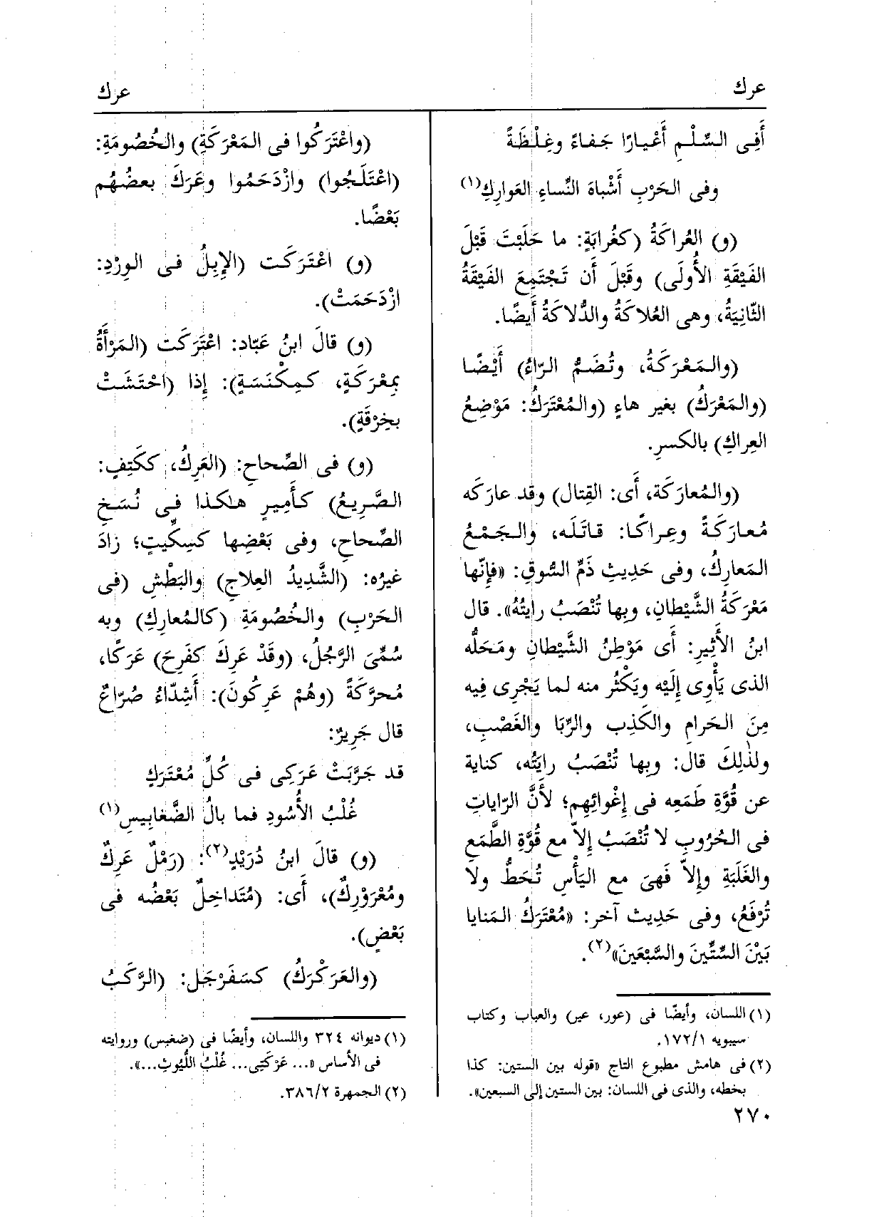والعُراكَةُ كغُرابَةٍ: مَا حَلَبتَ قَبلَ الفَيقَةِ الأُولَى وقَبلَ أَن تَجْتَمِعَ الفيقَةُ الثّانِيَةُ، وَهِي العُلاكَةُ والدُّلاكَةُ أَيْضا. المَعْرَكَةُ، وتُضَمُّ الرّاءُ أَيْضًا والمَعْرَكُ بِغَيْر هاءٍ والمُعْتَرَكُ: مَوْضِعُ العِراكِ بالكسرِ. والمُعارَكَة، أَي: القِتال وَقد عارَكَه مُعارَكَةً وعِراكًا: قاتَلَه، والجَمْعُ المَعارِكُ، وَفِي حَدِيثِ ذَمِّ السُّوقِ: فإِنّها مَعْرَكَةُ الشَّيطانِ، وَبهَا تُنْصَبُ رايتُهُ. قَالَ ابنُ الأَثِيرِ: أَي مَوْطِنُ الشَّيطانِ ومَحَلُّه الَّذِي يَأْوِي إِلَيه ويَكْثُر مِنْهُ لما يَجْرِي فِيه مِنَ الحَرامِ والكَذِب والربَا الغَصْبِ، ولذلِكَ قَالَ: وَبهَا تُنْصَبُ رايَتُه، كِنَايَة عَن قُوَّةِ طَمَعِه فِي إِغْوائِهم لأَنَّ الرّاياتِ فِي الحُرُوب لَا تُنْصَبُ إِلاّ مَعَ قوَّةِ الطَّمَعِ والغَلَبَةِ وِإلاَّ فَهي مَعَ اليَأْسِ تُحَطُّ وَلَا تُرفَعُ، وَفِي حَدِيث آخر: مُعْتَرَكُ المَنايا بَيْنَ السِّتِّينَ والسَّبعَينَ.