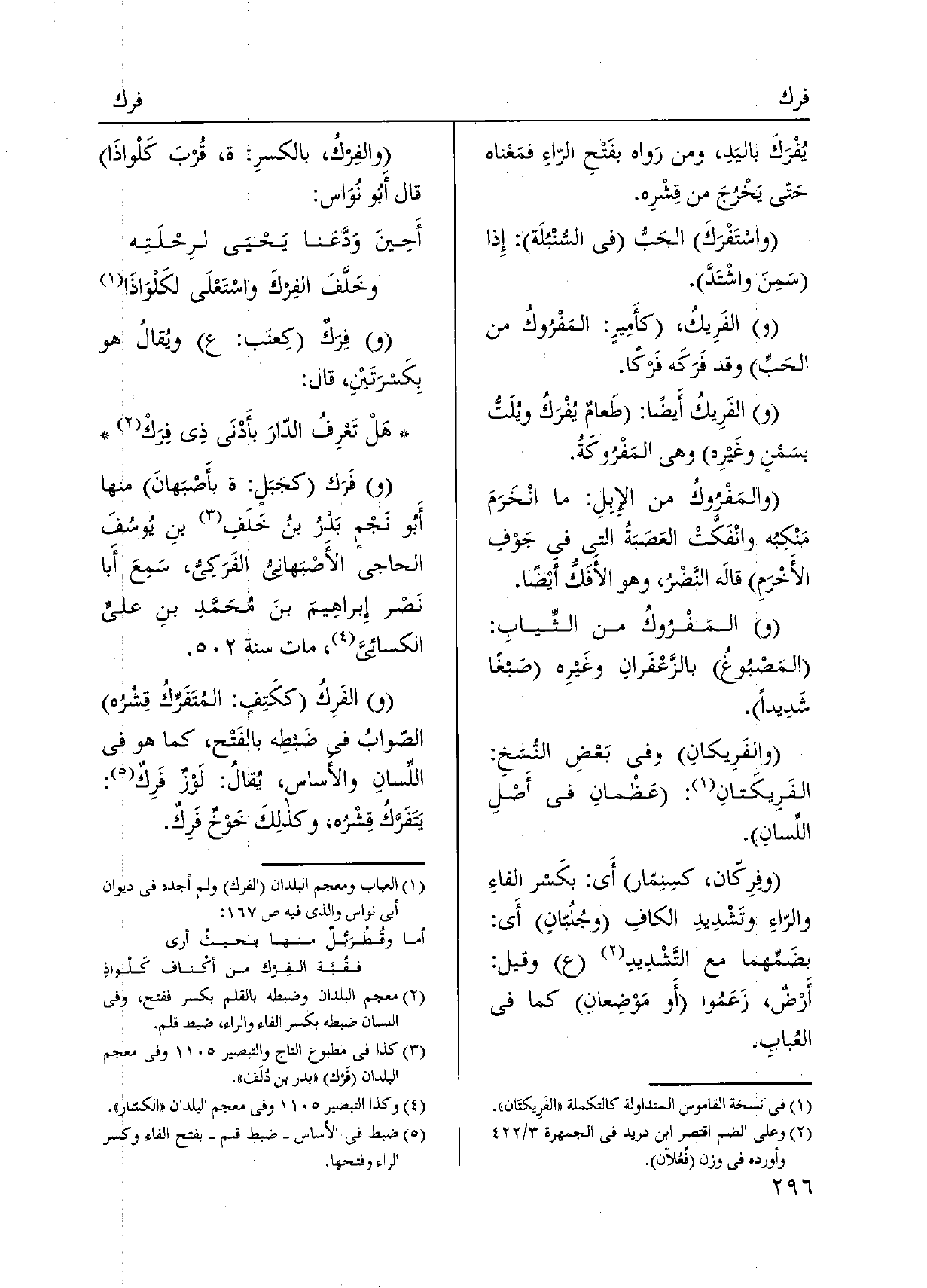 وفِرَكٌ كِعنَب: ويُقالُ هُوَ بِكَسرَتَيْنِ، قَالَ: هَلْ تَعْرِفُ الدّارَ بأَدْنَى ذِي فِرَكْ وفَرَك كجَبَلٍ: بأَصْبَهانَ مِنْهَا أَبو نَجْمٍ بَدْرُ بنُ خَلَفِ بنِ يُوسُفَ الحاجي الأَصْبَهانيُ الفَرَكِيُّ، سَمِعَ أَبا نَصْر إِبراهِيمَ بنَ مُحَمَّدِ بنِ عَليّ الْكسَائي، مَاتَ سنة. والفَرِكُ ككَتِفٍ: المُتَفَرِّكُ قِشْرُ الصّوابُ فِي ضَبطِه بالفَتْح، كَمَا هُوَ فِي اللِّسانِ والأساس، يُقالُ: لَوْزٌ فَرِكٌ: يَتَفَرَّكُ قِشْرُه، وكذلِكَ خَوْخٌ فَرِكٌ.