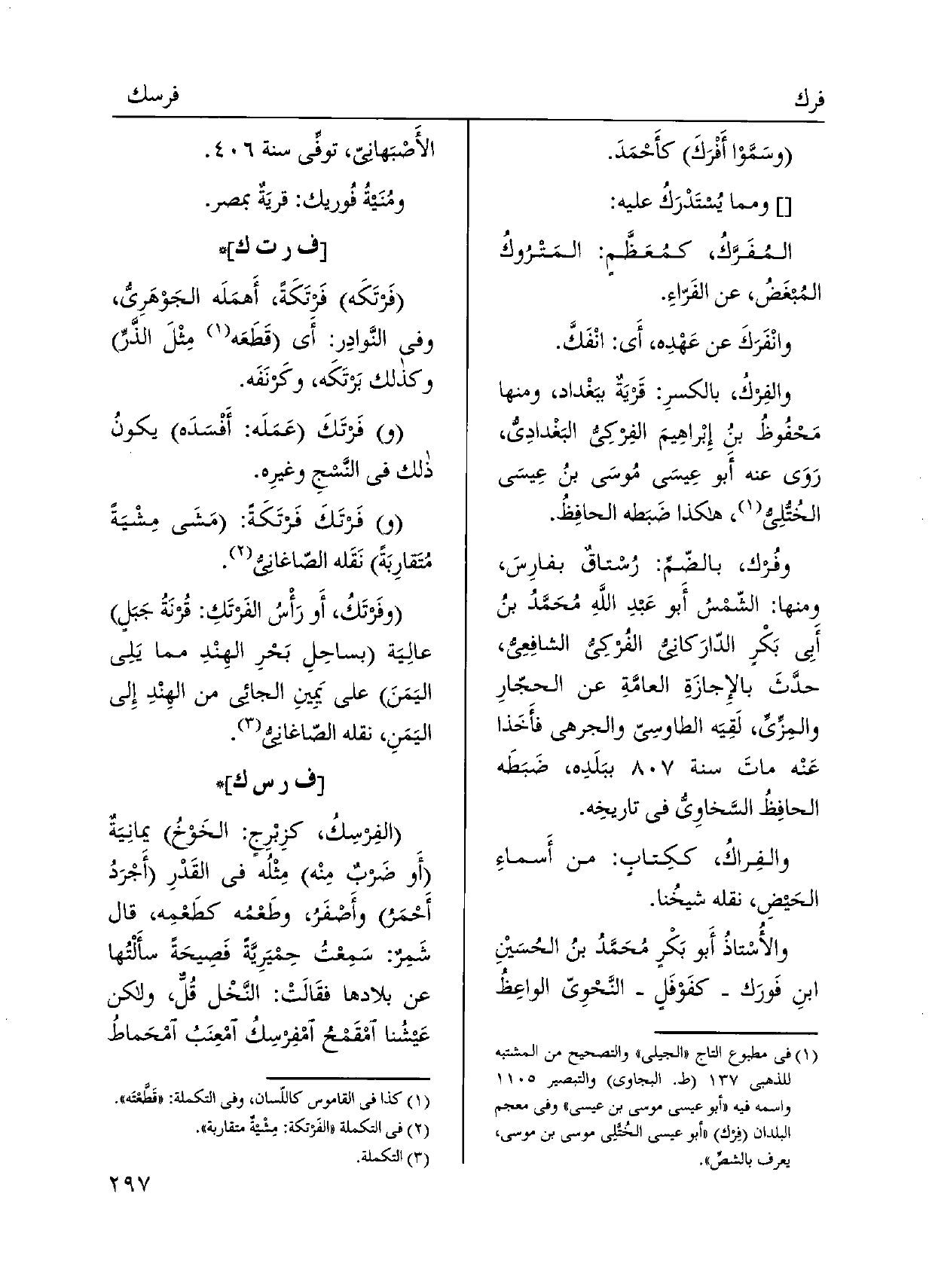 وفُرك، بالضّمِّ: رُسْتاقٌ بفارِسَ، وَمِنْهَا: الشّمْسُ أَبو عَبدِ اللَّهِ مُحَمَّدُ بنُ أبي بَكْرٍ الدّارَكاني الفُركِي الشافِعِيُ، حدَّثَ بالإِجازَةِ العامَّةِ عَن الحجّارِ والمِزِّيِّ، لَقِيَه الطاوسِي والجرهي فأَخَذا عَنْه ماتَ سنة ببَلَدِه، ضَبَطَه الحافِظُ السَّخاوِيّ فِي تاريخِه. والفِراكُ، ككِتابٍ: من أَسماءِ الحَيضِ، نَقله شيخُنا.