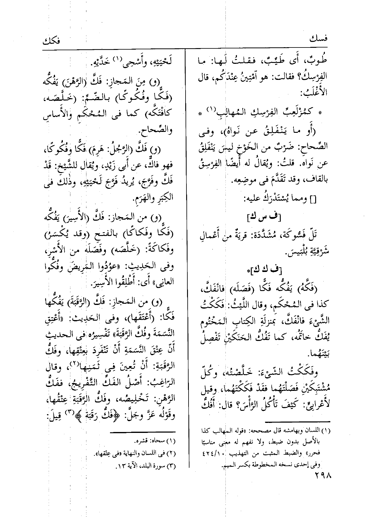 وَمن المَجاز: فَكَّ الأَسِيرَ {يَفُكُّه فَكًّا} وفَكاكًا بالفتحِ وَقد يُكْسَرُ {وفَكاكَةً: خَلَّصَه وفَصَلَه من الأَسْبرِ، وَفِي الحَدِيث: عوُدُوا المَرِيضَ} وفُكّوا العاني أَي: أَطْلِقُوا الأَسِيرَ. وَمن المَجازِ: فَكَّ الرَّقَبَةَ {يَفُكُّها فَكًّا: أَعْتَقَها، وَفِي الحَدِيث: أَعْتِقِ النَّسَمَةَ} وفُكَّ الرَّقَبَةَ تَفْسِيرُه فِي الحديثِ أَنّ عِتْقَ النَّسَمَةِ أَنْ تَنْفَرِدَ بعِتْقِها، وفَكُّ الرَّقَبَةِ: أَنْ تُعِينَ فِي ثَمَنِها، وَقَالَ الرّاغِبُ: أَصْلُ {الفَكِّ التَّفْرِيجُ،} ففَكُّ الرَّهْنِ: تَخْلِيصُه، {وفَكُّ الرَّقَبَةِ عِتْقُها، وقَوْلُه عَزَّ وجَلَّ:} فَكُّ رَقَبَة قِيلَ: