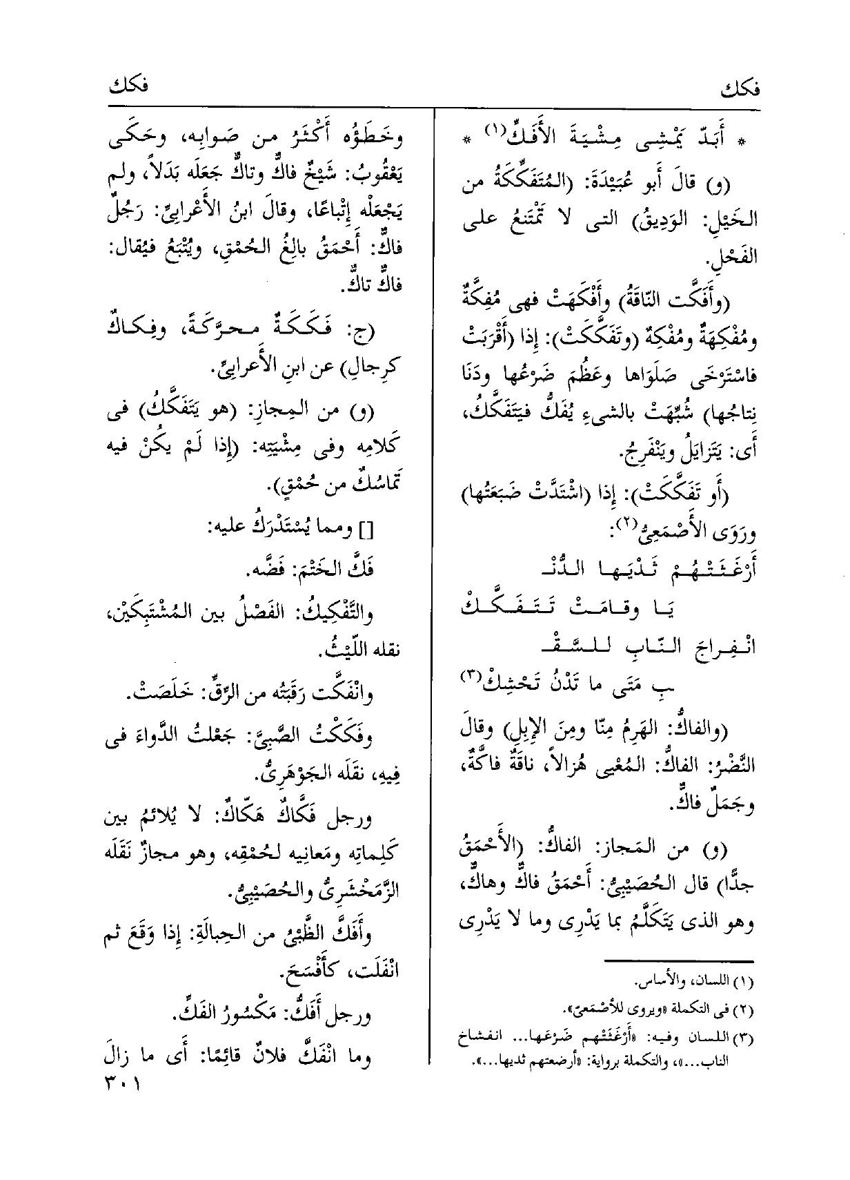 أَبَدّ يَمْشِي مِشْيَةَ الأفَكِّ وقالَ أَبو عُبَيدَةَ: {المُتَفَكِّكَةُ من الخَيلِ: الوَدِيقُ الَّتِي لَا تَمْتَنعُ على الفَحْلِ.} وأَفَكَّت النّاقَةُ وأَفْكَهَتْ فَهِيَ {مُفِكَّةٌ ومُفْكِهَةٌ} ومُفْكِهٌ {وتَفَكَّكَتْ: إِذا أَقْرَبَتْ فاسْتَرخَى صَلَوَاها وعَظُمَ ضَرعُها ودَنَا نِتاجُها شُبِّهَتْ بالشَّيْء} يُفَكُّ {فيتَفَكَّكُ، أَي: يَتَزايَلُ ويَنْفَرِجُ. أَو} تَفَكَّكَتْ: إِذا اشْتَدَّتْ ضَبَعَتُها ورَوَى الأَصْمَعِي: