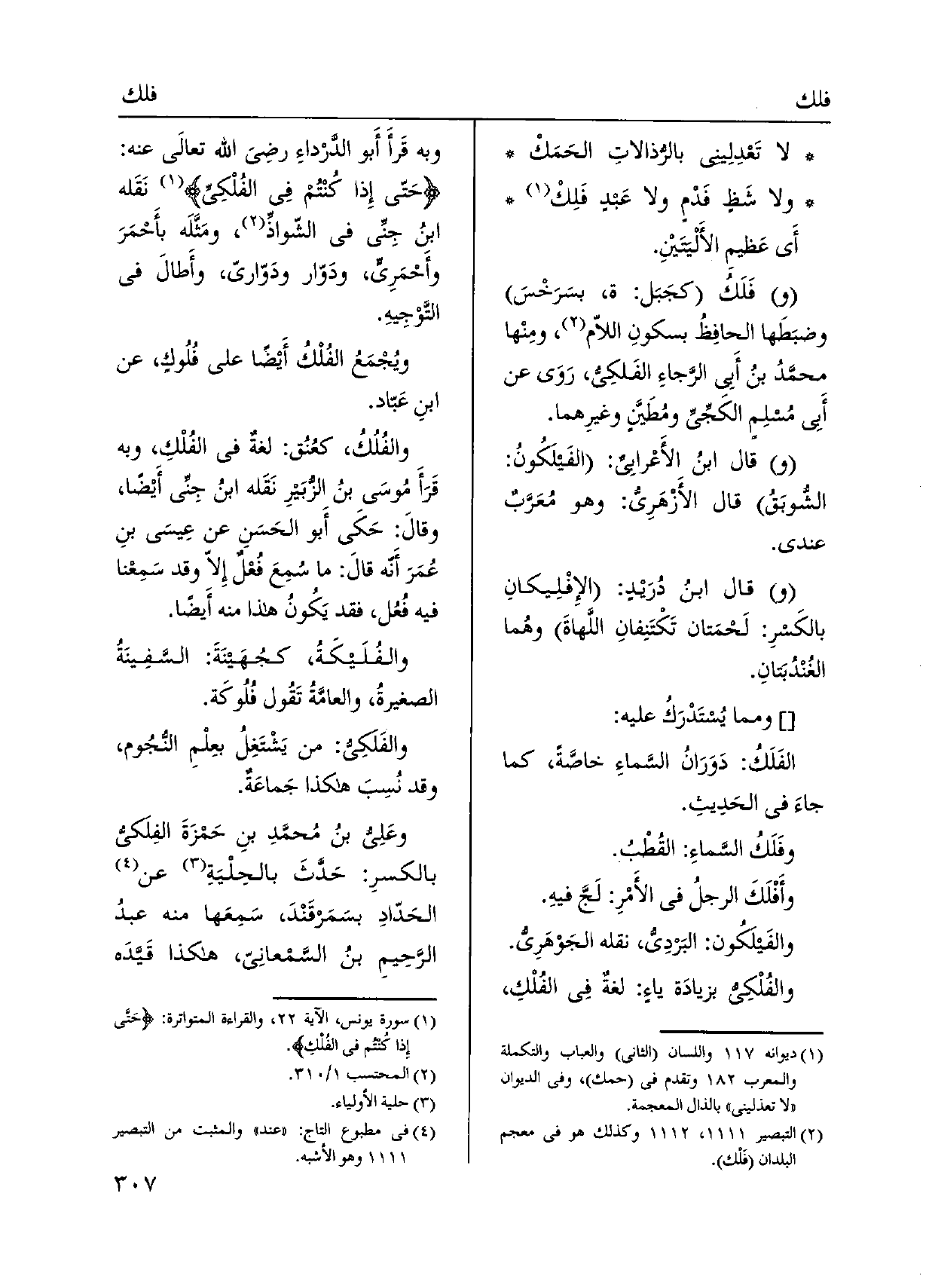 والفُلْكِي بزيادَة ياءٍ: لغةٌ فِي الفُلْكِ، وَبِه قَرأَ أَبو الدَّرْداءِ رَضِي الله تعالَى عَنهُ: حَتّى إِذا كُنْتُم فِي الفُلْكِي نَقَله ابنُ جِنِّي فِي الشّواذِّ، ومَثَّلَه بأَحْمَرَ وأَحْمَرِي، ودَوّار ودَوّاريّ، وأَطالَ فِي التَّوْجِيهِ. ويُجْمَعُ الفُلْكُ أَيْضًا على فُلُوكٍ، عَن ابنِ عَبّاد. والفُلُكُ، كعُنُق: لغةٌ فِي الفُلْكِ، وَبِه قَرَأَ مُوسَى بنُ الزّبَيرِ نَقَله ابنُ جِنِّي أَيْضًا، وقالَ: حَكَى أَبو الحَسَنِ عَن عِيسَى بنِ عُمَرَ أَنّه قالَ: مَا سُمِعَ فُعْلٌ إِلاّ وَقد سَمِعْنا فِيهِ فُعل، فقد يَكُونُ هَذَا مِنْهُ أَيضًا. والفُلَيكَةُ، كجُهَينَةَ: السَّفِينَةُ الصغيرةُ، والعامَّةُ تَقُول فُلُوكَة. والفَلَكِي: من يَشْتَغِلُ بعِلْمِ النّجُوم، وَقد نُسِبَ هَكَذَا جَماعَةٌ. وعَلِيّ بنُ مُحمَّدِ بنِ حَمْزَةَ الفِلَكي بالكسرِ: حَدَّثَ بالحِلْيَةِ عَن الحَدّادِ بسَمَرقَنْدَ، سَمِعَها مِنْهُ عبدُ الرَحِيمِ بنُ السَّمْعانِي، هَكَذَا قَيَّدَه