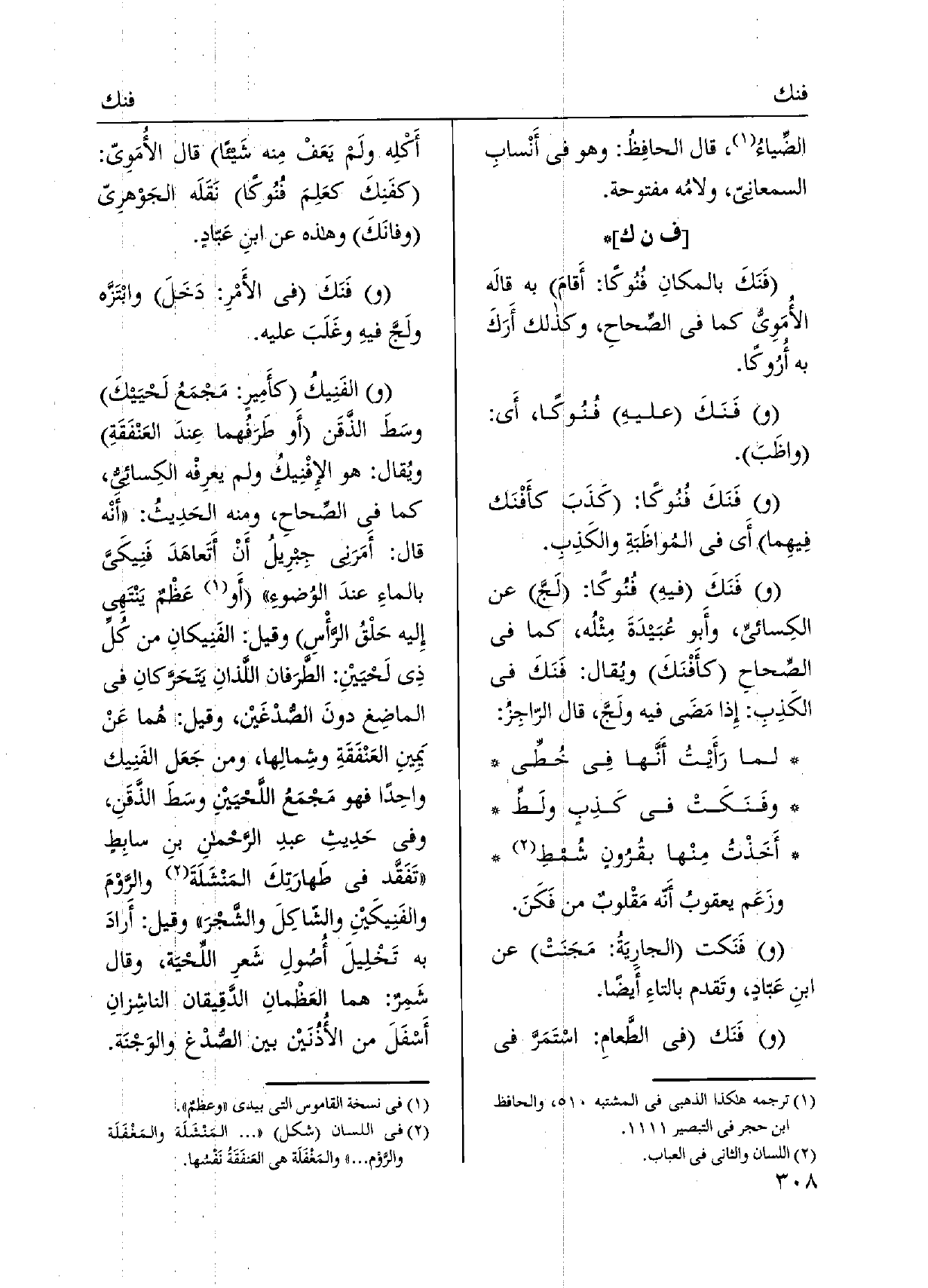 وفَنَكَ فِي الأَمْرِ: دَخَلَ وابْتَزَّه ولَجَّ فيهِ وغَلَبَ عَلَيْهِ. والفَنِيكُ كأَمِيرٍ: مَجْمَعُ لَحْيَيك وسَطَ الذَّقَن أَو طَرَفُهما عِندَ العَنْفَقَةِ ويُقال: هُوَ الإِفْنِيكُ وَلم يعرِفْه الكِسائيُّ، كَمَا فِي الصِّحاحِ، وَمِنْه الحَدِيثُ: أَنْه قَالَ: أَمَرَني جِبرِيلُ أَنْ أَتَعاهَدَ فَنِيكَيَ بالماءِ عندَ الوُضوءِ أَو عَظْمٌ يَنْتَهي إِليه حَلْقُ الرَّأْس وَقيل: الفَنِيكانِ من كُلَ ذِي لَحْيَين: الطَّرَفان اللَّذانِ يَتَحَرَّكانِ فِي الماضِي دونَ الصُّدْغَينْ، وَقيل: هُما عَنْ يَمِينِ العَنْفَقَةِ وشِمالِها، وَمن جَعَل الفَنِيك واحِدًا فَهُوَ مَجْمَعُ اللَّحْيَيْنِ وسَطَ الذَّقَنِ، وَفِي حَدِيثِ عبدِ الرَحْمنِ بنِ سابِطٍ تَفَقَّد فِي طَهارَتِكَ المَنْشَلَةَ والرَّوْمَ والفَنِيكَيْنِ والشّاكِلَ والشَّجْرَ وَقيل: أَرادَ بِهِ تَخْلِيلَ أُصُولِ شَعرِ اللِّحْيَة، وَقَالَ شَمِرٌ: هما العَظْمانِ الدَّقِيقان الناشِزانِ أَسْفَلَ من الأُذُنَينْ بَين الصُّدْغ والوَجْنَة.