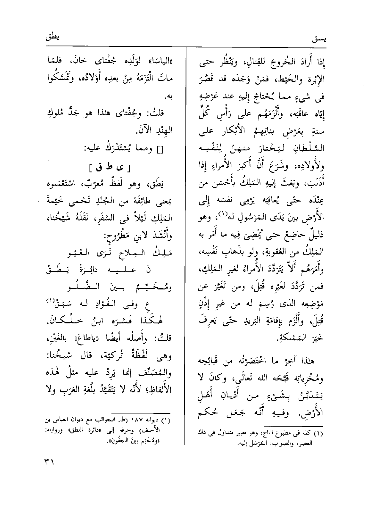 إِذا أَرادَ الخُروجَ للقِتالِ، ويَنْظُر حَتَّى الإِبْرة والخَيط، فمَنْ وَجَدَه قد قَصَّرَ فِي شيءٍ مِمَّا يُحْتاجُ إِليهِ عِنْد عَرضِهِ إِيّاه عاقَبَه، وأَلْزَمَهُم على رَأْسِ كُلِّ سنة بِعَرضِ بناتِهمُ الأبْكار على السُّلْطانِ ليَخْتارَ منهنّ لِنَفْسِه ولأَولادِه، وشَرَعَ أَنَّ أَكبرَ الأُمراءِ إِذا أَذَنَبَ، وبَعَثَ إليهِ المَلِكُ بأَحْسَن من عِنْدَه حتّى يُعاقِبَه يَرمي نفسَه إِلى الأَرْضِ بينَ يَدَي المَرسُولِ لَهُ، وَهُوَ ذليلٌ خاضِعٌ حَتَّى يُمْضِيَ فِيه مَا أَمَر بِهِ المَلِكُ من العُقوبةِ، وَلَو بذَهابِ نَفْسِه، وأَمَرَهُم أَلاَّ يَتَرَدَّدَ الأمراءُ لغيرِ المَلِكِ، فَمن تَرَدَّدَ لغَيرِه قُتِلَ، وَمن تَغَيَّرَ عَن مَوْضِعِه الَّذِي رُسِمَ لَهُ من غيرِ إِذْنٍ قُتِلَ، وأَلْزَم بإِقامَةِ البَريدِ حتّى يَعرِفَ خَبَرَ المَمْلكةِ. هَذَا آخِرُ مَا اخْتَصَرتُه من قَبائِحِه ومُخْزِياتِه قَبَّحَه الله تَعالَى، وكانَ لَا يَتَدَيَّنُ بِشَيء من أَدْيانِ أَهْلِ الأَرْض. وفيهِ أَنّه جَعَل حُكم الياسَا لوَلَدِه جُفْتاي خانَ، فلمّا ماتَ الْتَزَمَهُ مِنْ بعدِه أَوْلادُه، وَتمَسَّكُوا بِهِ. قلتُ: وجُفْتاي هَذَا هُوَ جَدُّ مُلوكِ الهنْدِ الآنَ.