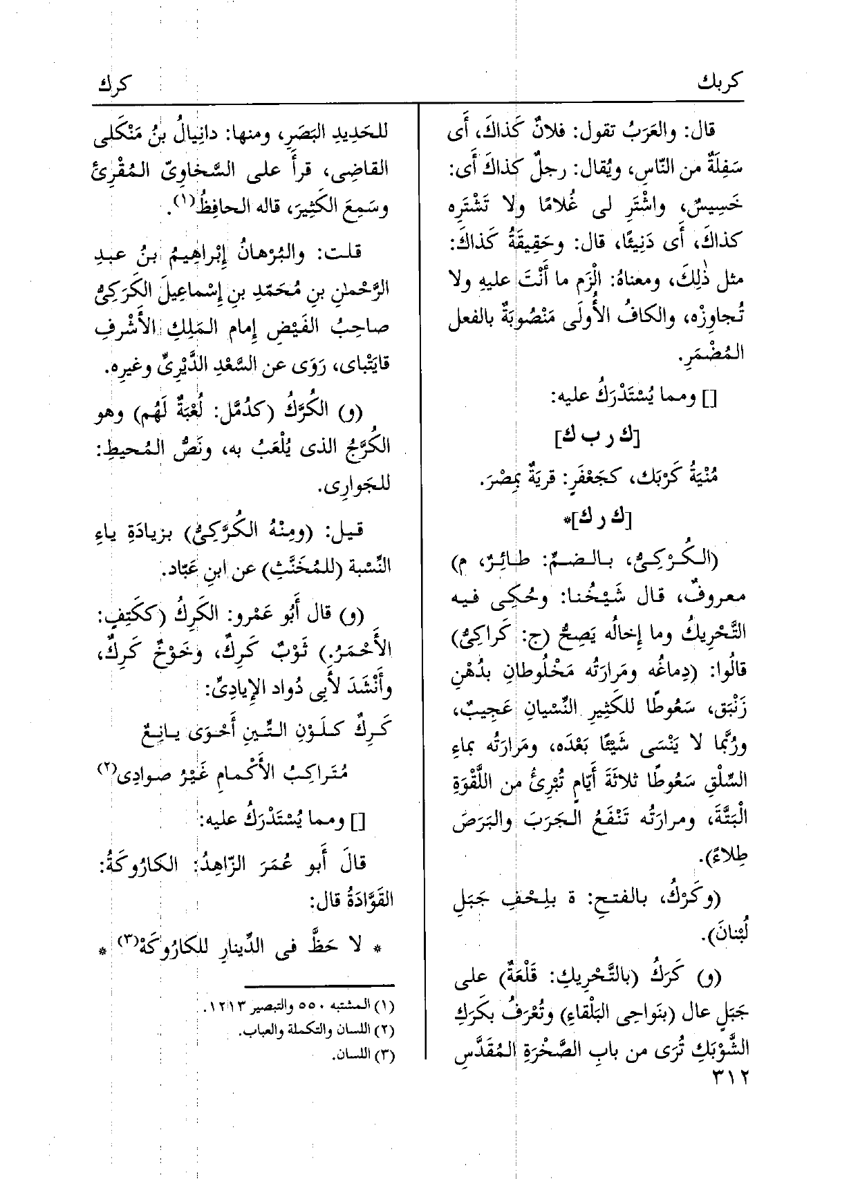الكركِي، بالضمِّ: طائِرٌ، معروفٌ، قَالَ شَيخُنا: وحُكِي فِيهِ التَّحْرِيكُ وَمَا إِخاله يَصِحُّ كَراكِيُ قالُوا: دِماغُه ومَرارَتُه مَخْلُوطانِ بدُهْنِ زَنْبَق، سَعُوطًا للكَثِيرِ النِّسيانِ عَجِيبٌ، ورُّبما لَا يَنْسَى شَيئًا بَعْدَه، ومَرارَتُه بماءِ السِّلْقِ سَعُوطًا ثلاثَةَ أَيّامٍ تبرِئُ من اللَّقْوَةِ الْبَتَّةَ، ومرارَتُه تَنْفَعُ الجَرَبَ والبَرَصَ طِلاءً. وكَركُ، بالفتحِ: بلِحْفِ جَبَلِ لُبنانَ. وكَرَكُ بالتَّحْرِيكِ: قَلْعَةٌ على جَبَلٍ عَال بنَواحِي البَلْقاءِ وتُعرَفُ بكَرَكِ الشَّوْبَكِ تُرَى من بَاب الصَّخْرَةِ المُقَدَّس للحَدِيدِ البَصَرِ، وَمِنْهَا: دانِيال بنُ مَنْكَلي القاضِي، قرأَ على السَّخاوِيّ المُقْرِئَ وسَمِعَ الكَثِيرَ، قَالَه الحافِظُ. قلت: والبُرهانُ إِبْراهِيمُ بنُ عبدِ الرَحْمنِ بنِ مُحَمّدِ بنِ إِسْماعِيلَ الكَرَكِي صَاحب الفَيضِ إِمام المَلِكِ الأَشْرفِ قايَتْباي، رَوَى عَن السَّعْدِ الدَّيْرِيِّ وغيرِه. والكُرَّكُ كدُمَّل: لُعْبَةٌ لَهُم وَهُوَ الكُرَّجُ الَّذِي يُلْعَبُ بِهِ، ونَصُّ المُحيطِ: للجَوارِي. قيل: ومِنْهُ الكُرَّكِيُّ بزيادَةِ ياءِ النّسبة للمُخَنَّثِ عَن ابنِ عَبّاد. وَقَالَ أَبُو عَمْرو: الكَرِك ككَتِفٍ: الأَحْمَرُ. ثَوْبٌ كَرِكٌ، وخَوْخ كَرِكٌ، وأَنْشَدَ لأبي دواد الإِيادِيِّ: