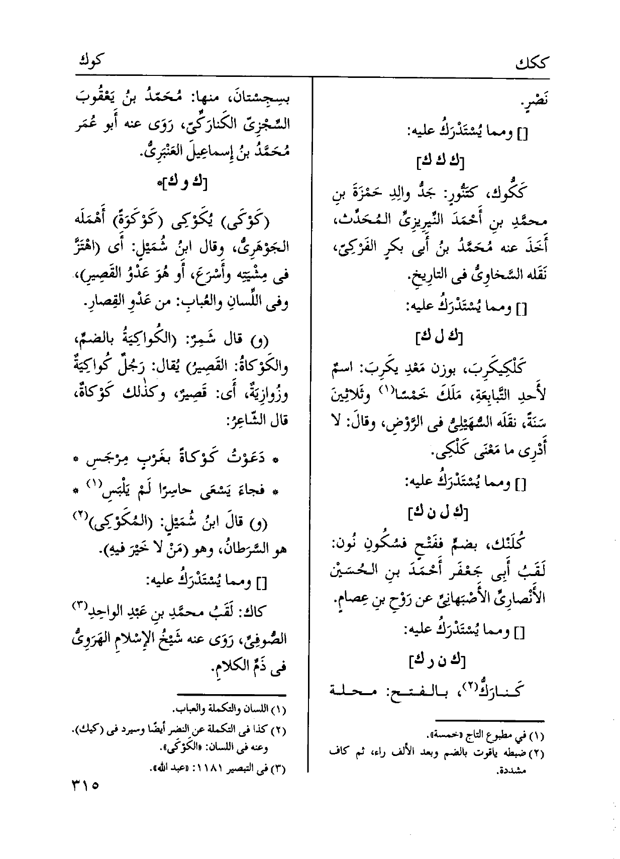 {كَكُّوك، كتَنُّورٍ: جَدُّ والِدِ حَمزَةَ بنِ محمَّدِ بنِ أَحْمَدَ النِّيرِيزِيِّ المُحَدِّث، أَخَذَ عَنهُ مُحًمّدُ بنُ أَبي بكرٍ الفركِي، نَقَله السَّخاوِيُّ فِي التارِيخِ.