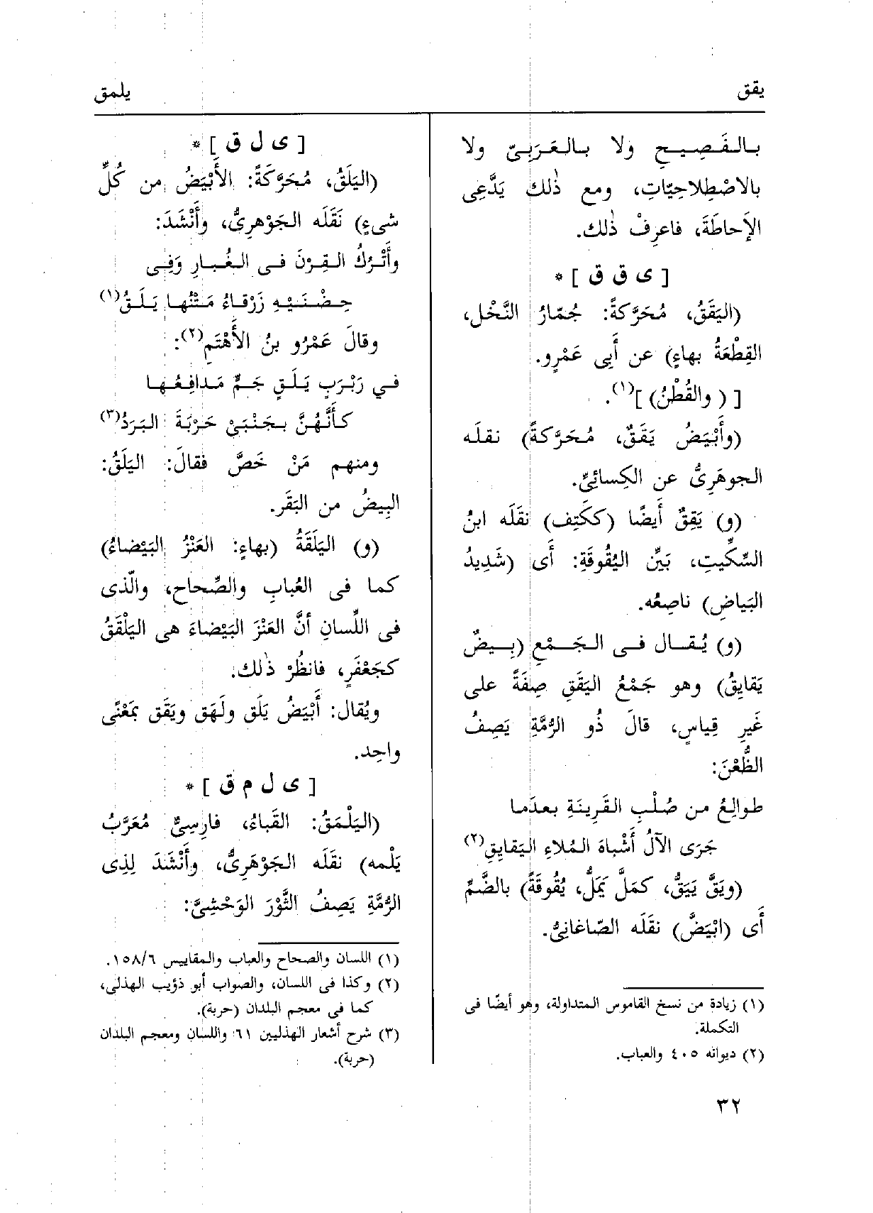 وَمِنْهُم مَنْ خَصَّ فقالَ: اليَلَقُ: البِيضُ من البَقَر. (و) } اليَلَقَةُ بهاء: العَنْزُ البَيضاءُ كَمَا فِي العُبابِ والصِّحاح، وَالَّذِي فِي اللِّسانِ أنَّ العَنْزَ البَيضاءَ هِيَ {اليَلْقَقُ كجَعْفَرٍ، فانظُر ذَلِك. ويُقال: أَبْيَضُ يَلَق ولَهَق ويَقَق بمَعْنًى واحِد.