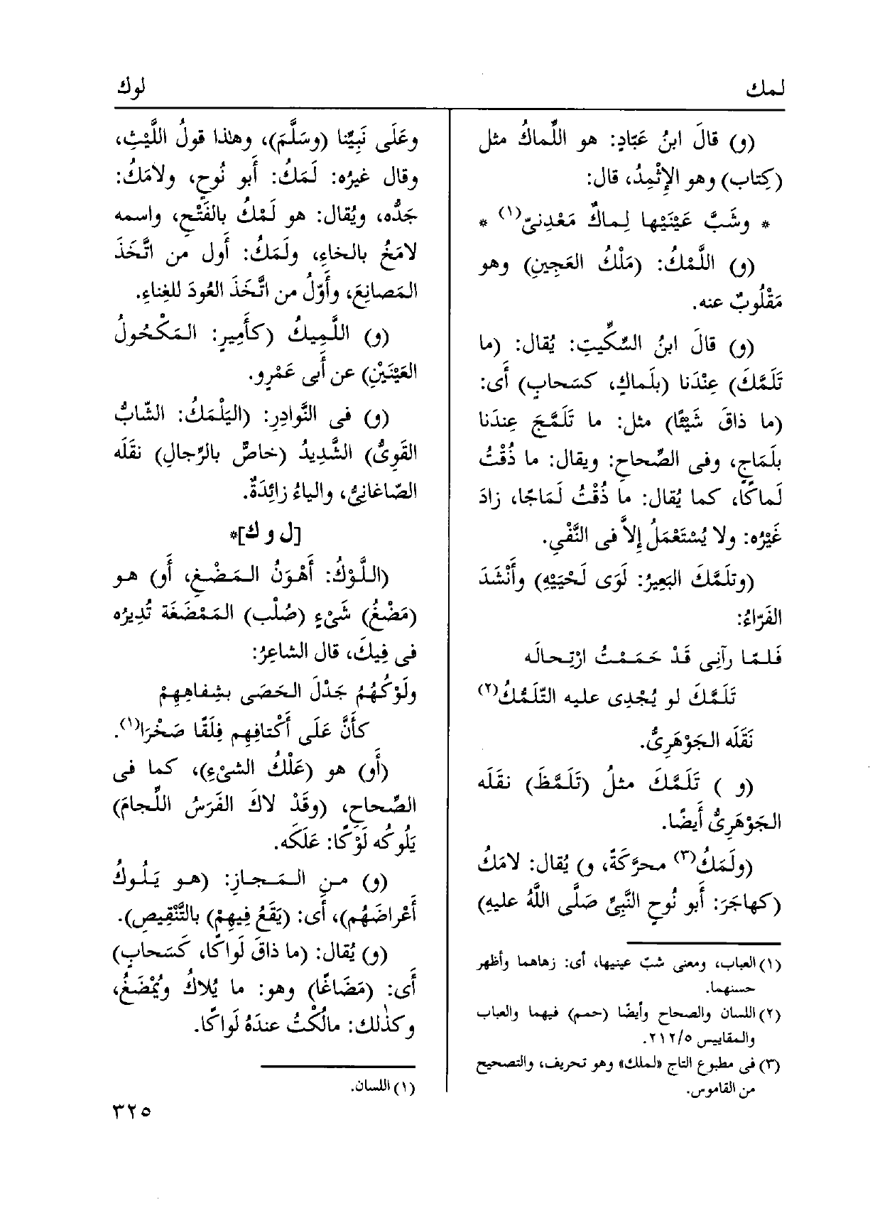 ولَمَكُ محرَّكَةً، ويُقال: لامَكُ كهاجَرَ: أَبو نُوحٍ النَّبِي صَلَّى اللَّه عليهِ وعَلَى نَبِينا وسًلّمَ، وَهَذَا قولُ اللَّيثِ، وَقَالَ غيرُه: لَمَكُ: أَبو نوحٍ، ولامَكُ: جَدّه، ويُقال: هُوَ لَمْكُ بالفَتْحِ، واسْمه لامَخُ بالخاءِ، ولَمَكُ: أَول من اتَّخَذَ المَصانِعَ، وأَوّلى من اتَّخَذَ العُودَ للغِناءِ.