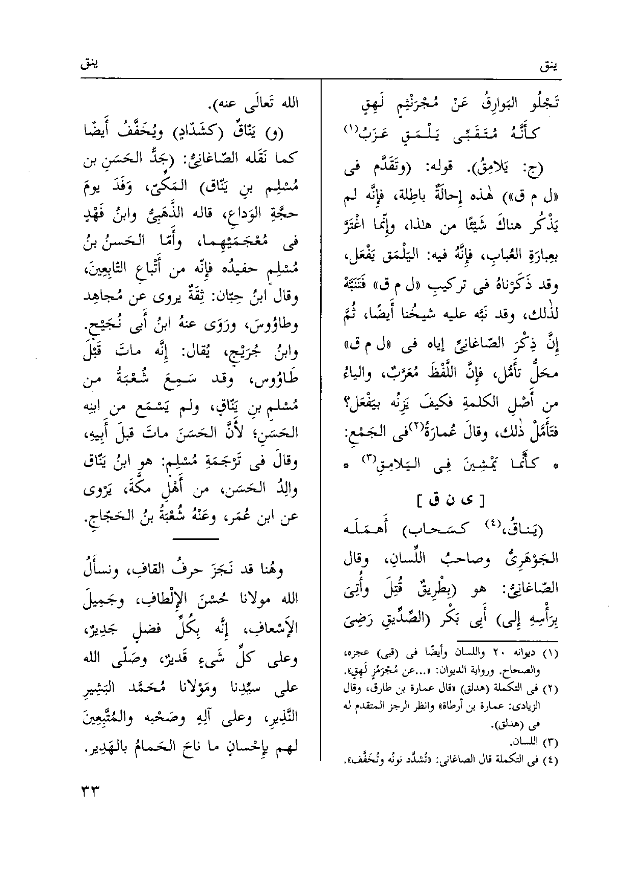 } يَناقُ، كسَحاب أَهمَلَه الجَوْهَرِيُّ وصاحبُ اللِّسانِ، وَقَالَ الصّاغاني: هُوَ بِطْرِيقٌ قُتِلَ وأُتِيَ بِرَأْسِهِ إِلى أبي بَكْر الصِّدِّيقِ رَضِي الله تَعالَى عَنهُ. (و) ! يَنّاقٌ كشَدّادٍ ويُخَفَّفُ أَيْضا كَمَا نَقَله الصّاغاني: جَدُّ الحَسَنِ بن مُسلِم بنِ يَنّاق المَكي، وَفَدَ يومَ حجَّةِ الوَداعِ، قَالَه الذَّهَبِيُّ وابنُ فَهْد فِي معْجَمَيهما، وأَمّا الحَسن بنُ مُسلِمِ حفيدُه فإِنّه من أَتْباعِ التّابِعِينَ، وَقَالَ ابنُ حِبّان: ثِقَةٌ يرْوى عَن مجاهِد وطاوُوس، ورَوَى عنهُ ابنُ أبي نُجَيح. وابنُ جُرَيْجٍ، يُقال: إِنَّه مَاتَ قَبل طَاوُوس، وَقد سَمِعَ شُعْبَةُ من مُسلمِ بنِ يَنّاقٍ، وَلم يَسمَع من ابنِه الحَسن، لأَنَّ الحَسَنَ ماتَ قبلَ أَبِيهِ، وقالَ فِي تَرجَمَةِ مُسلم: هُوَ ابنُ يَنّاق والِدُ الحَسَن، من أَهْلِ مكَّةَ، يَروى عَن ابْن عمَر، وعَنْهُ شُعْبَة بنُ الحَجّاجِ. وهُنا قد نَجَزَ حرفُ القافِ، ونسأَلُ الله مَوْلَانَا حُسنَ الإلْطافِ، وجَمِيلَ الإَسْعافِ، إِنَّه بِكُلِّ فضِلِ جَدِيرٌ، وعَلى كلِّ شَيءٍ قَديرٌ، وصَلّى الله على سيِّدِنا ومَوْلانا مُحَمَّد البَشِيرِ النَّذِيرِ، وعَلى آلِهِ وصَحْبه والمُتَّبِعِينَ لَهُم بإِحْسان مَا ناحَ الحَمامُ بالهَدِير.