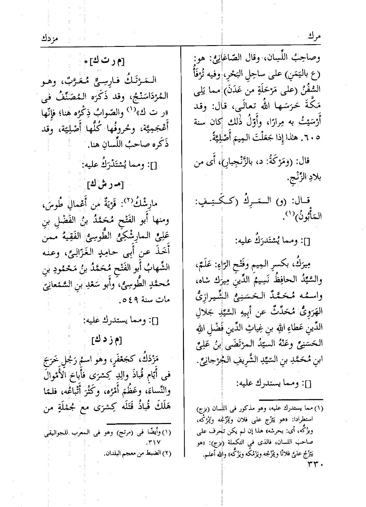 المَرتَكُ فارِسيٌ مُعَرَّبٌ، وَهُوَ المُردَاسَنْجُ، وَقد ذَكَرَه المُصَنِّفُ فِي ر ت ك والصّوابُ ذِكْرُه هُنَا فإِنّها أَعْجَمِيَّة، وحُروفُها كُلُّها أَصْلِيّة، وَقد ذَكَره صَاحب اللِّسانِ هُنَا.