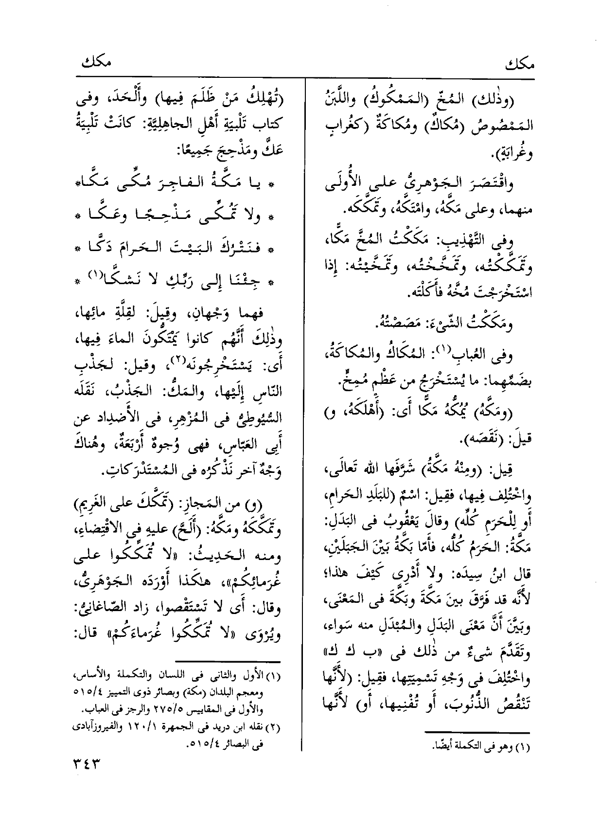 ومَكَّهُ يُمُكُّهُ مَكّا أَي: أَهْلَكَهُ، وقيلَ: نَقَصَه. قِيل: ومِنْهُ {مَكَّةُ شَرَّفَها الله تَعالَى، واخْتُلِف فِيها، فقِيل: اسْمٌ للبَلَدِ الحَرامِ، أَو لِلْحَرَمِ كُلِّه وقالَ يَعْقُوبُ فِي البَدَلِ: مَكَّةُ: الحَرَمُ كُلُّه، فأَمّا بَكَّةُ بَين الجَبَلَين، قَالَ ابنُ سِيدَه: وَلَا أَدْرِي كَيفَ هَذَا لأَنَّه قد فَرَّقَ بينَ مَكَّةَ وبَكَّةَ فِي المَعْنَى، وبَيَّنَ أَنَّ مَعْنَى البَدَلِ والمبدَلِ مِنْهُ سَواء، وتَقَدَّمَ شَيْء من ذَلِك فِي ب ك ك واخْتُلِفَ فِي وَجْهِ تَسميتِها، فقِيل: لأَنَّها تَنْقُصُ الذُّنُوبَ، أَو تُفْنِيها، أَو لأَنَّها تُهْلِكُ مَنْ ظَلَمَ فِيها وأَلْحَدَ، وَفِي كتاب تَلْبيَةِ أَهْلِ الجاهِلِيَّةِ: كَانَت تَلْبِيَةُ عَكَّ ومَذْحِجَ جَمِيعًا: يَا مَكَّةُ الفاجِرَ} مُكِّي مَكَّا وَلَا تَمُكِّي مَذْحِجًا وعَكَّا فنَتْرُكَ البَيتَ الحَرامَ دَكَّا جِئْنَا إِلى رَبِّكِ لَا نَشكَّا فهما وَجْهانِ، وقِيلَ: لقِلَّةِ مائِها، وذلِكَ أَنَّهُم كَانُوا {يَمْتَكُّونَ الماءَ فِيها، أَي: يَستَخْرِجُونَه، وَقيل: لجَذْبِ النّاسِ إِلَيها،} والمَكُّ: الجَذْب، نَقَلَه السُّيُوطِي فِي المُزْهِرِ، فِي الأَضدِاد عَن أبي العَبّاسِ، فَهِيَ وُجوهٌ أَرْبَعَةٌ، وهُناكَ وَجْهٌ آخر نَذْكُرُه فِي المُستَدْرَكاتِ.)
