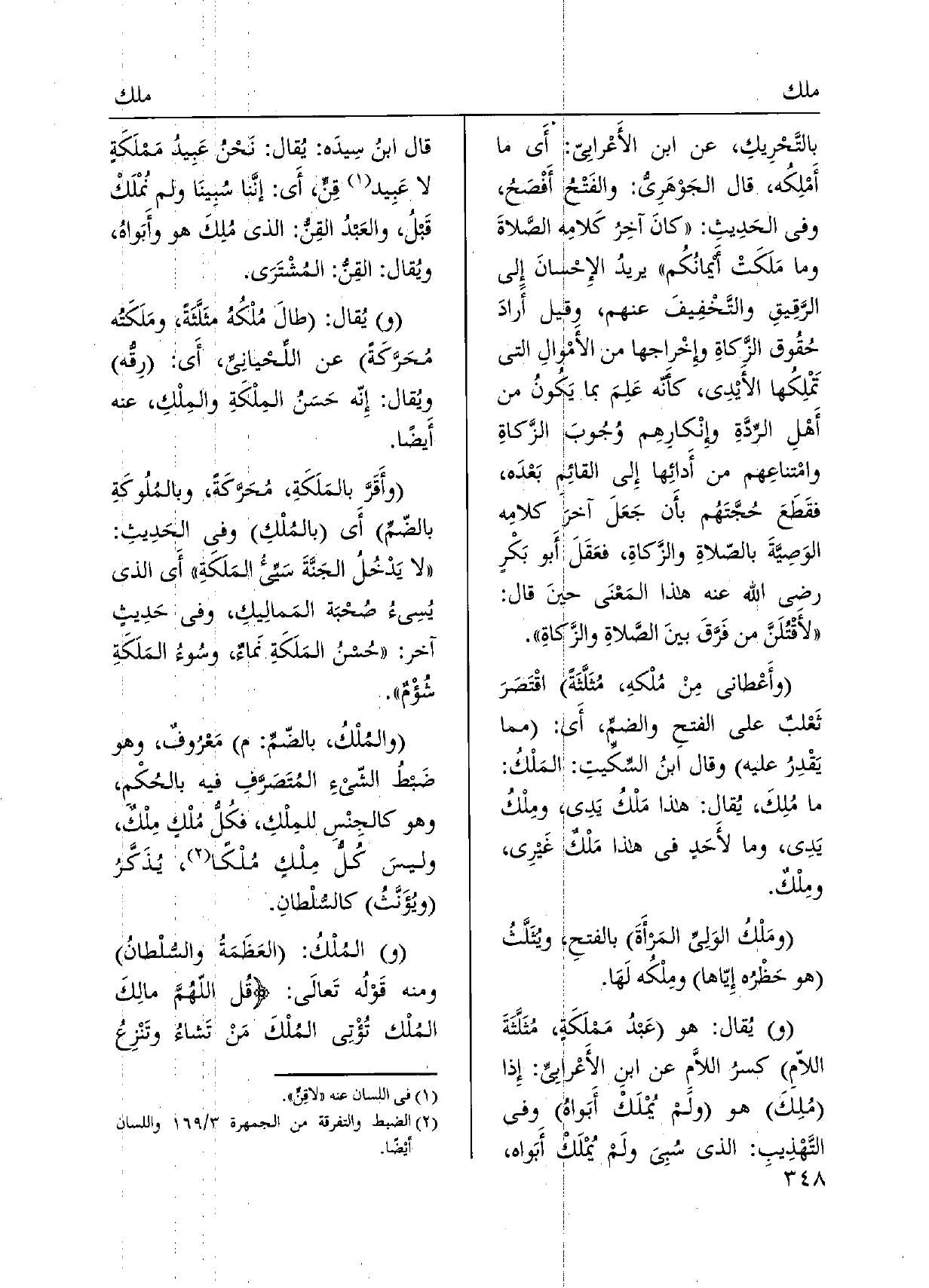 ويُقال: طالَ مُلْكُهُ مثَلَّثَةً، ومَلَكَتُه مُحَرَكَةً عَن اللِّحْيانِيِّ، أَي: رِقُّه ويُقال: إِنّه حَسَنُ المِلْكَةِ والمِلْكِ، عَنهُ أَيضًا.