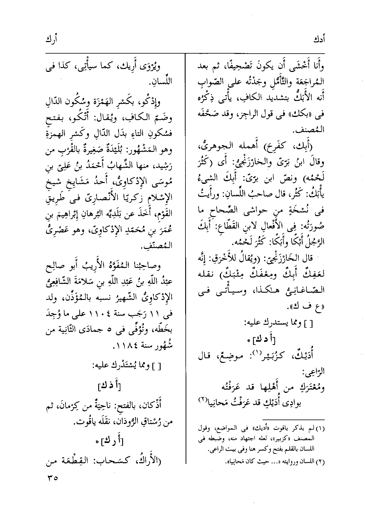 ويُرْوَى أَرِيك، كَمَا سيأْتِي، كَذَا فِي اللِّسانِ.} وِإدْكُو، بِكَسْر الهَمْزَة وسُكُون الدّالِ وضَمّ الكافِ، ويُقال: أَتْكو، بفتحٍ فسُكونِ التاءِ بدَل الدّالِ وَكسر الهمزةِ وَهُوَ المَشْهُور: بُلَيدَةٌ صَغِيرةٌ بالقُربِ من رَشِيد، مِنْهَا الشِّهابُ أَحْمَدُ بنُ عَلِي بنِ مُوسَى {- الإِدْكاوِيُّ، أَحدُ مَشَايِخِ شيخِ الإِسْلامِ زكريّا الأَنْصارِيّ فِي طَرِيقِ القَوْمِ، أخَذَ عَن بَلَدِيِّه البُرهانِ إِبْراهِيمَ بنِ عُمَرَ بنِ مُحَمّدٍ الإِدْكاوِيّ، وَهُوَ عَصْرِيُّ المُصنّفِ. وصاحِبُنا المُفَوَّهُ الأَرِيب أَبو صالِح عبدُ اللهِ بنُ عَبدِ اللهِ بنِ سَلامَةَ الشّافِعِي الإِدْكاوِيُّ الشّهيرُ نسبه بالمُؤَذِّن، ولد فِي رَجب سنة على مَا وُجِدَ بخَطّه، وتُوُفي فِي جمادَى الثّانِية من شُهُور سنة.
