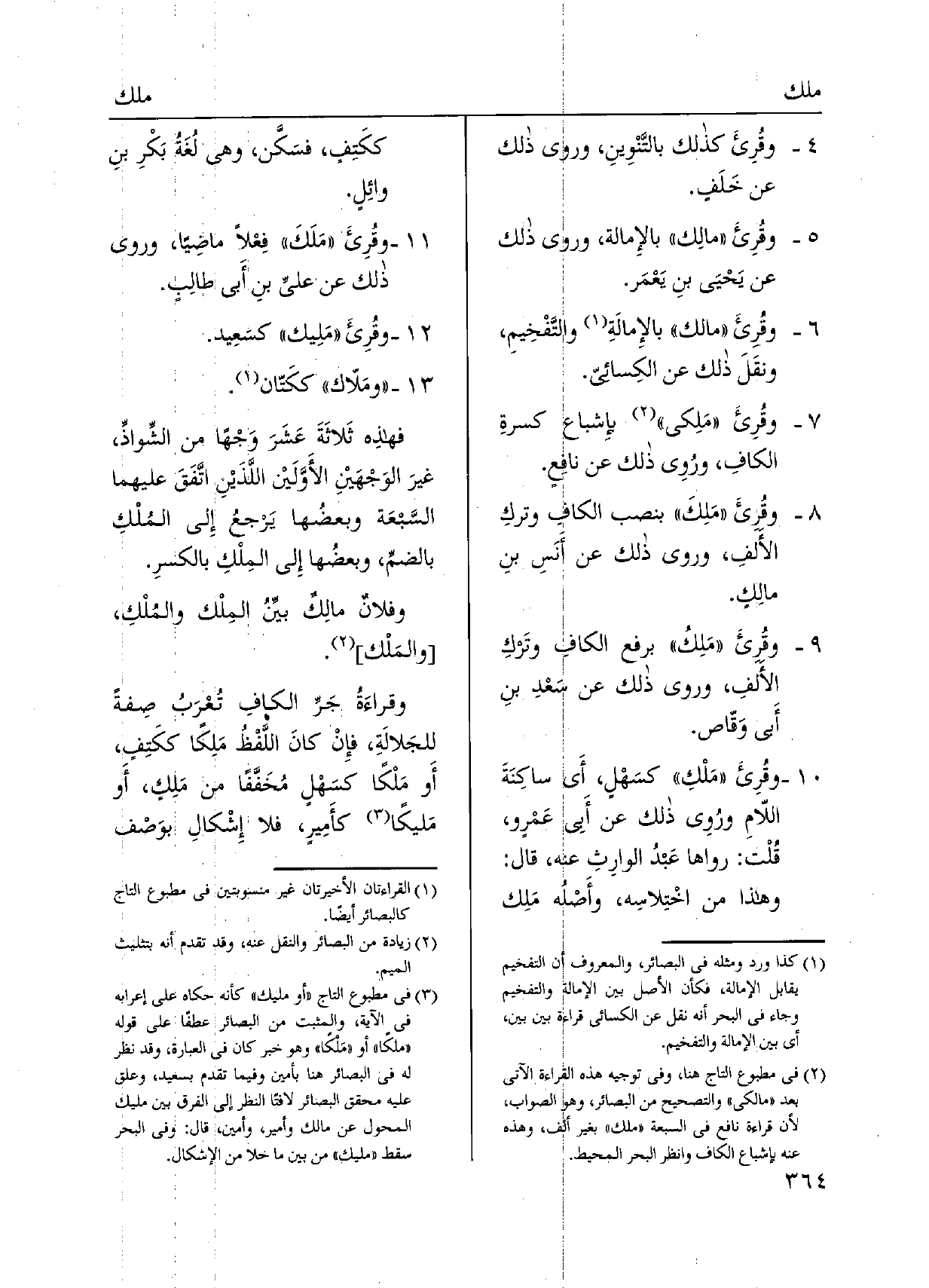فهذِه ثَلاثَةَ عَشَرَ وَجْهًا من الشِّواذِّ، غيرَ الوَجْهَيْنِ الأَوَّلَينْ اللَّذَيْنِ اتَّفَقَ عَلَيْهِمَا السَّبعَة وبعضُها يَرجعُ إِلى المُلْكِ بالضمِّ، وبعضُها إِلى المِلْكِ بالكسرِ.