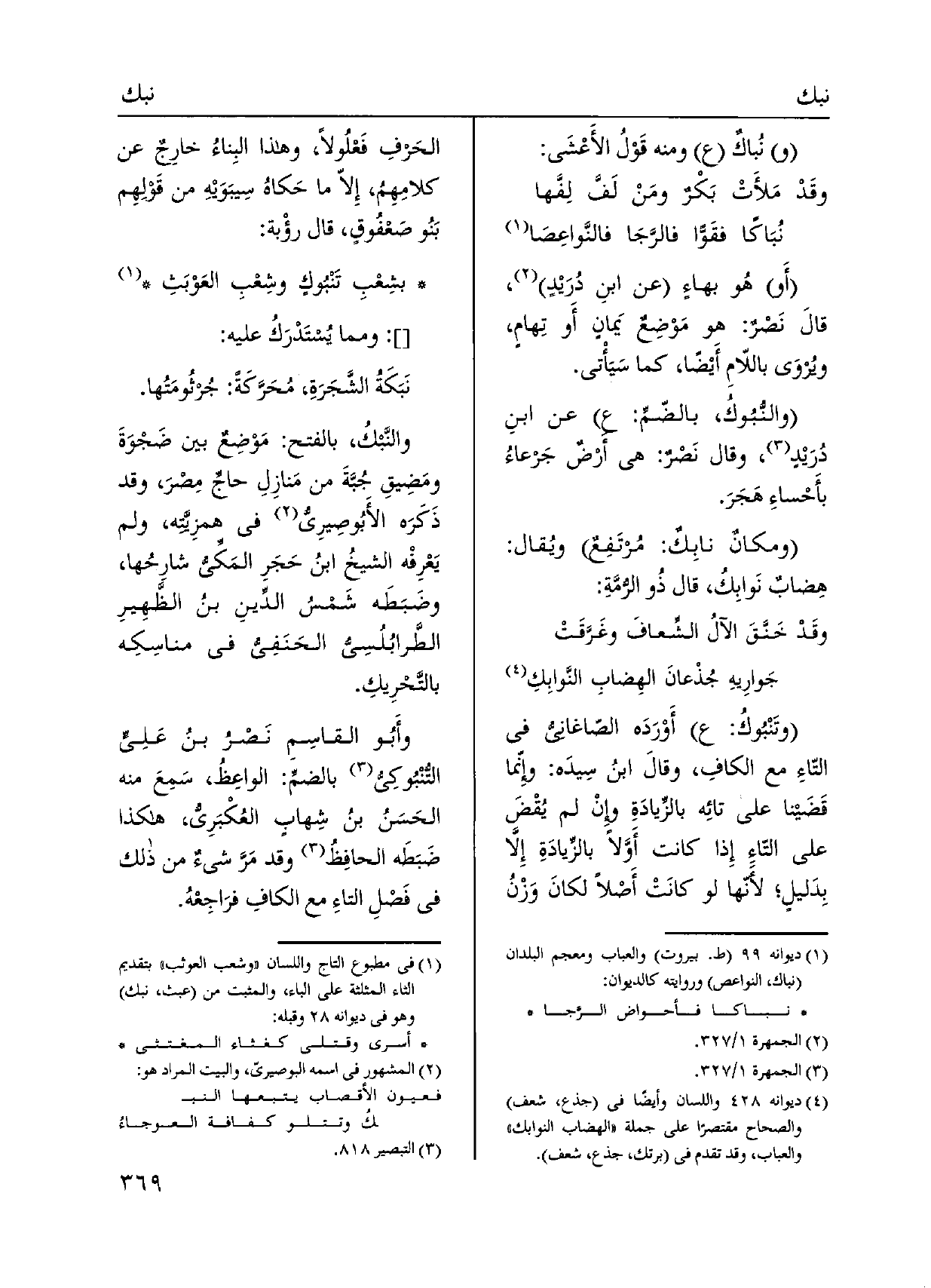 وتَنْبُوكُ: أَوْرَدَه الصّاغاني فِي التّاءِ مَعَ الكافِ، وقالَ ابنُ سِيدَه: وِإنّما قَضَينا على تائِه بالزِّيادَةِ وِإنْ لم يُقْضَ على التّاءٍ إِذا كَانَت أَوَّلاً بالزِّيادَةِ إِلا بِدَليل لأنّها لَو كانَتْ أَصْلاً لكانَ وَزْنُ الحرفِ فَعْلُولاً، وَهَذَا البِناءُ خارِجٌ عَن كلامِهِمُ، إِلاّ مَا حَكاهُ سِيبَوَيْهِ من قَوْلِهِم بَنُو صَعْفوقٍ، قَالَ رؤْبة: بشِعْبِ تَنْبُوكٍ وشِعْبِ العَوْبَثِ وَمِمَّا يسْتَدرك عَلَيْهِ: نَبَكَةُ الشَّجَرَةِ، مُحَرَّكَةً: جُرثُومَتُها.