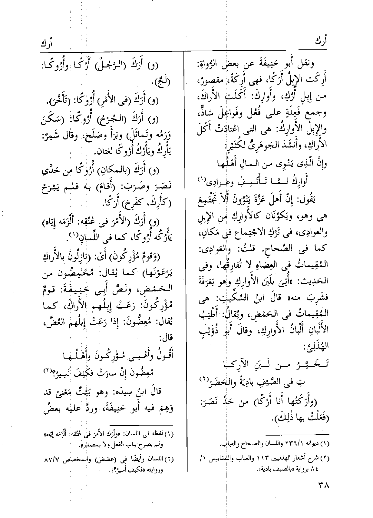 وَنقل أَبُو حَنِيفَةَ عَن بعضِ الرُّواةِ: {أَرِكَت الإبلُ} أَرَكًا، فَهِيَ {أَرِكَةٌ، مقصورٌ، من إِبِلٍ} أرُكٍ، {وأَوارِكَ: أَكَلَت} الأَراكَ، وَجمع فَعِلَةٍ على فُعُل وفَواعِلَ شاذٌّ، والإِبِلُ {الأَوارِكُ: هِيَ الَّتِي اعتادَتْ أَكْلَ الأَراكِ، وأَنشَدَ الجَوهَرِيُّ لكُثَيِّر: