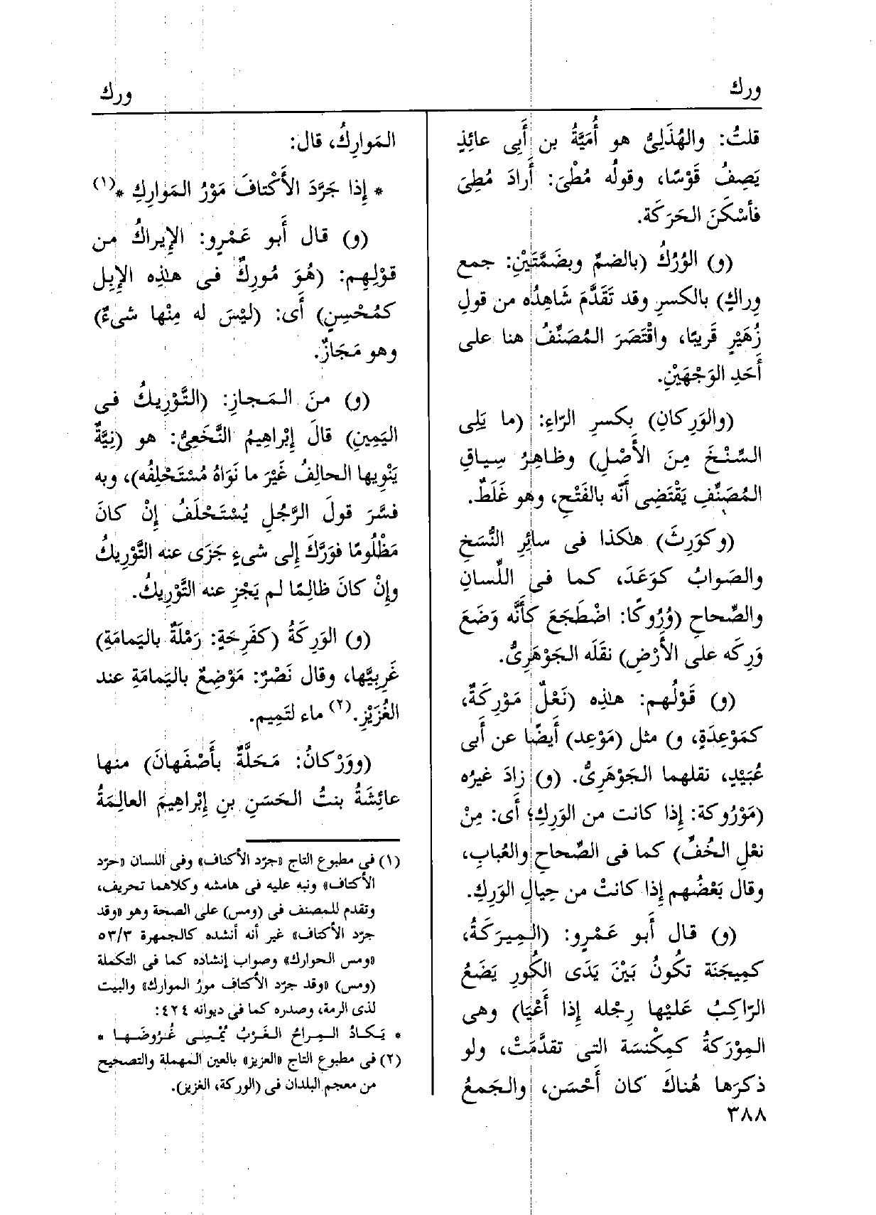 وَقَالَ أَبو عَمْرو:} المِيرَكَةُ، كمِيجَنَة تكُونُ بَيْنَ يَدَي الكُورِ يَضَعُ الرّاكِبُ عَليها رِجْله إِذا أَعْيَا وَهِي المِورَكةُ كمِكنسَة التّي تقدَّمَتْ، وَلَو ذكرَها هُناكَ كَانَ أَحْسَن، والجَمع المَوارِكُ، قَالَ: إِذا جَرَّدَ الأَكْتافَ مَوْرُ {المَوارِكِ وَقَالَ أَبو عَمْرو:} الإِيراكُ من قوْلِهِم: هُوَ {مُورِكٌ فِي هذِه الإِبِل كمُحْسِن أَي: ليسَ لَهُ مِنْها شيءٌ وَهُوَ مَجَازٌ.