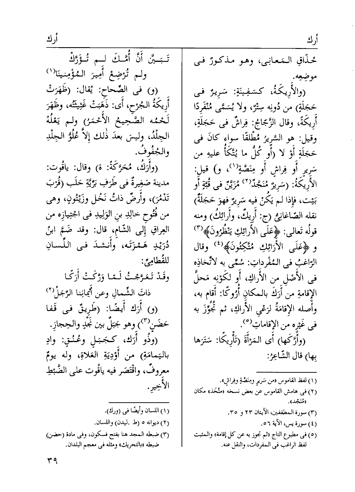 {والأَرِيكَةُ، كسَفِينَةٍ: سَرِيرٌ فِي حَجَلَةٍ من دُونِه سِتْرٌ، وَلَا يُسَمَّى مُنْفَرِداً} أَرِيكَةً، وَقَالَ الزَّجّاج: فِراشٌ فِي حَجَلَةٍ، وَقيل: هُوَ السَّرِيرُ مُطْلقاً سَوَاء كانَ فِي حَجَلَةٍ أَوْ لَا أَو كُلُّ مَا يُتَّكَأُ عليهِ من سَريرٍ أَو فِراشٍ أَو مِنَصَّةٍ، وقيلِ: {الأَرِيكَةُ: سَرِيرٌ مُنَجَّدٌ مُزَيَّنٌ فِي قُبَّةٍ أَو بَيت، فإِذا لم يَكُنْ فِيهِ سَرِيرٌ فهوَ حَجَلَةٌ نَقله الصّاغاني} أَريكٌ، {وأَرائِكُ وَمِنْه قولُه تَعالى: عَلَى} الأرائِكِ يَنْظُرُونَ وعَلَى {الأرَائِكِ مُتَّكِئُونَ وَقَالَ الرّاغبُ فِي المُفْرداتِ: سُمِّى بِهِ لاتِّخاذِه فِي الأَصْلِ من} الأَراكِ، أَو لكَوْنِه مَحلَّ الْإِقَامَة من {أَرَكَ بالمكانِ} أرُوكاً: أَقام بِهِ، وَأَصله الإِقامَةُ لرَعْيِ الأَراكِ، ثمَّ تُجُوِّزَ بِهِ فِي غَيرِه من الإقاماتِ. {وأَرَّكَها أَي المَرأَةَ} تَأْرِيكاً: سَتَرَها بِها قَالَ الشّاعِرُ: