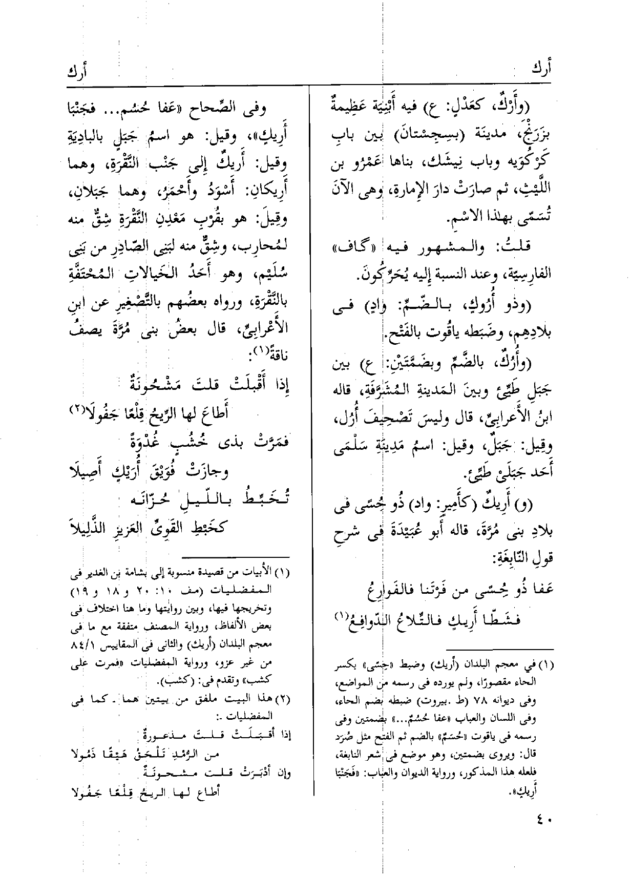 قلت: وَالْمَشْهُور فِيهِ كَاف الفارِسِيّة، وَعند النِّسْبَة إِلَيْهِ يُحَرِّكُونَ. وَذُو} أرُوكٍ، بالضّمِّ: وادٍ فِي بلادِهِم، وضَبَطه ياقُوت بالفَتْح. {وأُرُكٌ، بالضمِّ وبضَمَّتَيْنِ: بَين جَبَلِ طَيِّئ وبينَ المَدينةِ المُشَرَّفةِ، قَالَه ابنُ الأَعرابي، قَالَ وَلَيْسَ تَصْحِيفَ أُرل، وقِيل: جَبَل، وَقيل: اسمُ مَدِينَةِ سَلْمَى أَحَد جَبَلَي طَيِّئ. (و) } أَرِيكٌ كأَمِير: وَاد ذُو حِسى فِي بلادِ بني مُرَّةَ، قَالَه أَبُو عُبَيدَةَ فِي شرحِ قولِ النّابِغَةِ: