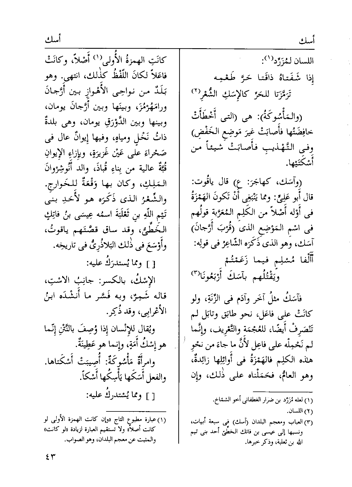 {فآسَكُ مثلُ آخَر وآدَم فِي الزِّنَةِ، وَلَو كانَتْ على فاعَل، نَحْو طابَق وتابَل لم تَنْصَرِفْ أَيْضا، للعُجْمَة والتَّعْرِيف، وإِنَّما لم نَحْمِلْه على فاعِل لأَنَّ مَا جاءَ من نحْوِ هَذِه الكلِم فالهَمْزَةُ فِي أَوائِلِها زائِدةٌ، وَهُوَ الْعَالم، فحَمَلْناه على ذَلِك، وِإن كانَتِ الهمزةُ الأُولى أَصْلاً، وَكَانَت فاعَلاً لكانَ اللّفْظُ كَذَلِك، انْتهى. وَهُوَ بَلَدٌ من نواحي الأَهْوازِ بَين أرَّجانَ ورامَهُرمُزَ، وبينَها وَبَين أَرَّجانَ يَوْمَانِ، وَبَينهَا وَبَين الدَّوْرَقِ يَوْمَانِ، وَهِي بلدةٌ ذاتُ نَخْلٍ ومياهٍ، وفيهَا إِيوانٌ عَال فِي صَحْراءَ على عَيْن غَزيرَةٍ، وبازاءِ الإِيوانِ قُبةٌ عالية من بِناءِ قُباذَ، وَالِد أَنُوشِروانَ المَلِكِ، وَكَانَ بهَا وَقْعَةٌ للخَوارجِ. والشِّعْرُ الَّذِي ذَكَرَه هُوَ لأَحَدِ بني تَيمِ اللهِ بنِ ثَعْلَبَةَ اسمُه عِيسَى بنُ فاتِكٍ الخَطِّى، وَقد سَاق قصَّتَهم)
