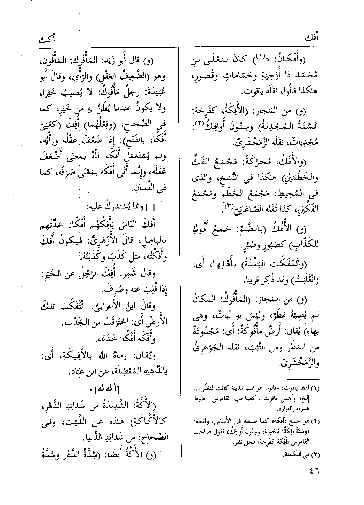{وائْتَفَكَت البَلْدَةُ بأَهْلِها، أَي: انْقَلَبَتْ وَقد ذُكِر قريبَاً. وَمن المَجاز:} المَأْفُوكُ: المكانُ لم يُصِبهُ مَطَرٌ، وليسَ بِهِ نَباتٌ، وَهِي بهاءٍ يُقال: أَرضٌ {مأْفُوكَةٌ: أَي: مَجْدودَة من المَطَر وَمن النَّبتِ، نَقله الجَوْهرِيُّ والزَّمَخْشَرِيّ. وَقَالَ أَبو زَيْد: المَأْفُوك: المَأْفون، وَهُوَ الضَّعِيفُ العَقْلِ والرّأي، وقالَ أَبو عُبَيدَةَ: رجلٌ} مَأْفُوكٌ: لَا يصيبُ خَيراً، وَلَا يكونُ عِنْدَمَا يُظَنُّ بهِ من خَيرٍ، كَمَا فِي الصحاحِ، وفِعْلُهُما أُفِكَ كعنِيَ أَفْكًا، بالفَتْحِ: إِذا ضَعُفَ عقْلُه ورأْيُه، وَلم يُستَعْمَلِ أَفَكًه اللهُ بمعنَى أَضْعَفَ عَقْلَه، وإِنِّما أتَى أَفَكَه بمَعْنَى صَرَفَه، كَمَا فِي اللِّسانِ.