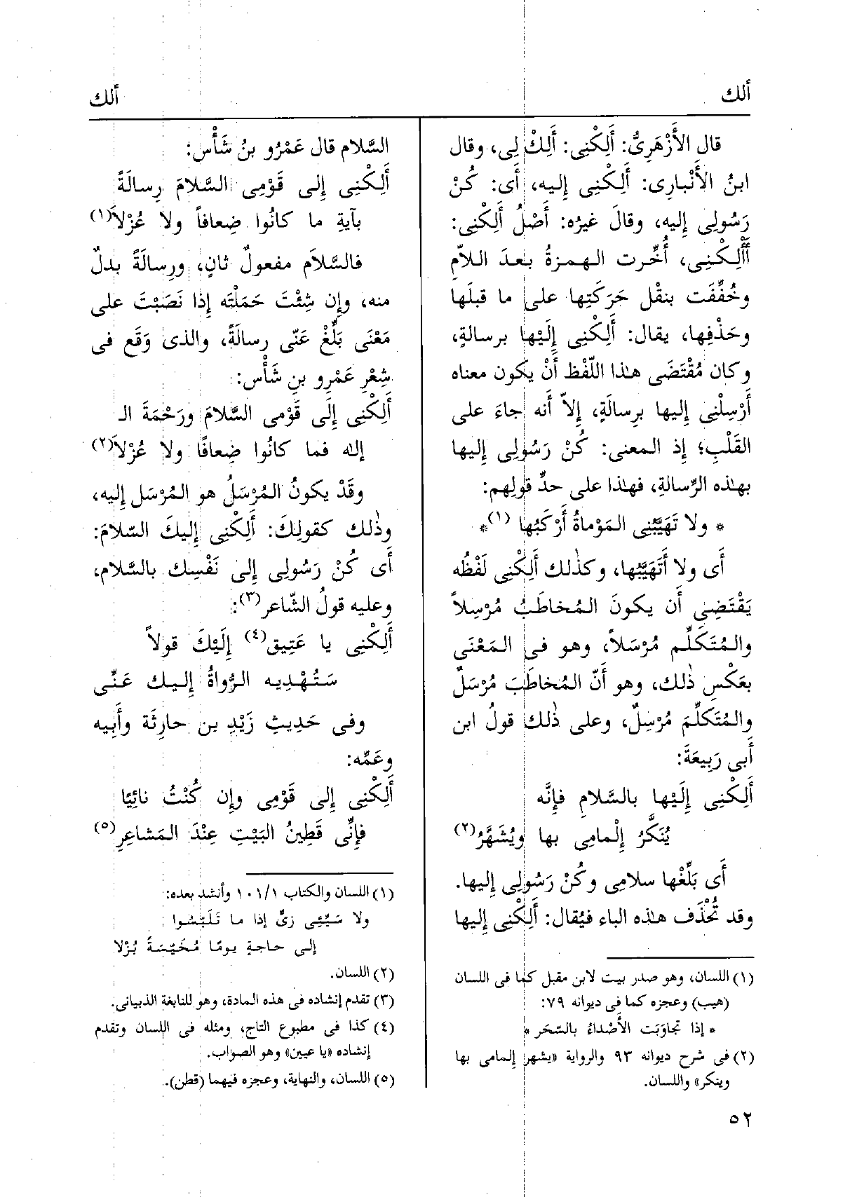 قَالَ الأزْهَرِيُّ: {- ألِكني:} أَلِكْ لَي، وَقَالَ ابنُ الأَنْبارِي: أَلِكْني إِليه، أَي: كُنْ رَسُولِي إِليه، وقالَ غيرُه: أَصْلُ أَلِكْني:! - أألِكْنِي، أُخِّرت الهمزةُ بعدَ اللاّمِ وخُفِّفَت بنقْل حَرَكَتِها على مَا قبلَها وحَذْفِها، يُقَال: أَلِكْنِي إلَيها برسالةٍ، وَكَانَ مُقْتَضَى هَذَا اللّفْظ أنْ يكون مَعْنَاهُ أَرْسِلْني إِليها برِسالَةٍ إِلاّ أَنه جاءَ على القَلْب إِذ الْمَعْنى: كُنْ رَسُولي إِليها بِهَذِهِ الرِّسالةِ، فَهَذَا على حدِّ قولِهم: وَلَا تَهَيَّبني المَوْماةُ أَرْكَبُها أَي وَلَا أَتَهَيَّبُها، وَكَذَلِكَ أَلِكْني لَفْظه يَقْتَضي أَن يكونَ المُخاطَبُ مرسِلاً والمتَكَلِّم مرسَلاً، وَهُوَ فِي المَعْنَى بعَكسِ ذَلِك، وَهُوَ أَنّ المُخاطَبَ مُرسَل والمُتَكلِّمَ مُرسِلٌ، وعَلى ذَلِك قولُ ابْن أبي رَبِيعَةَ: