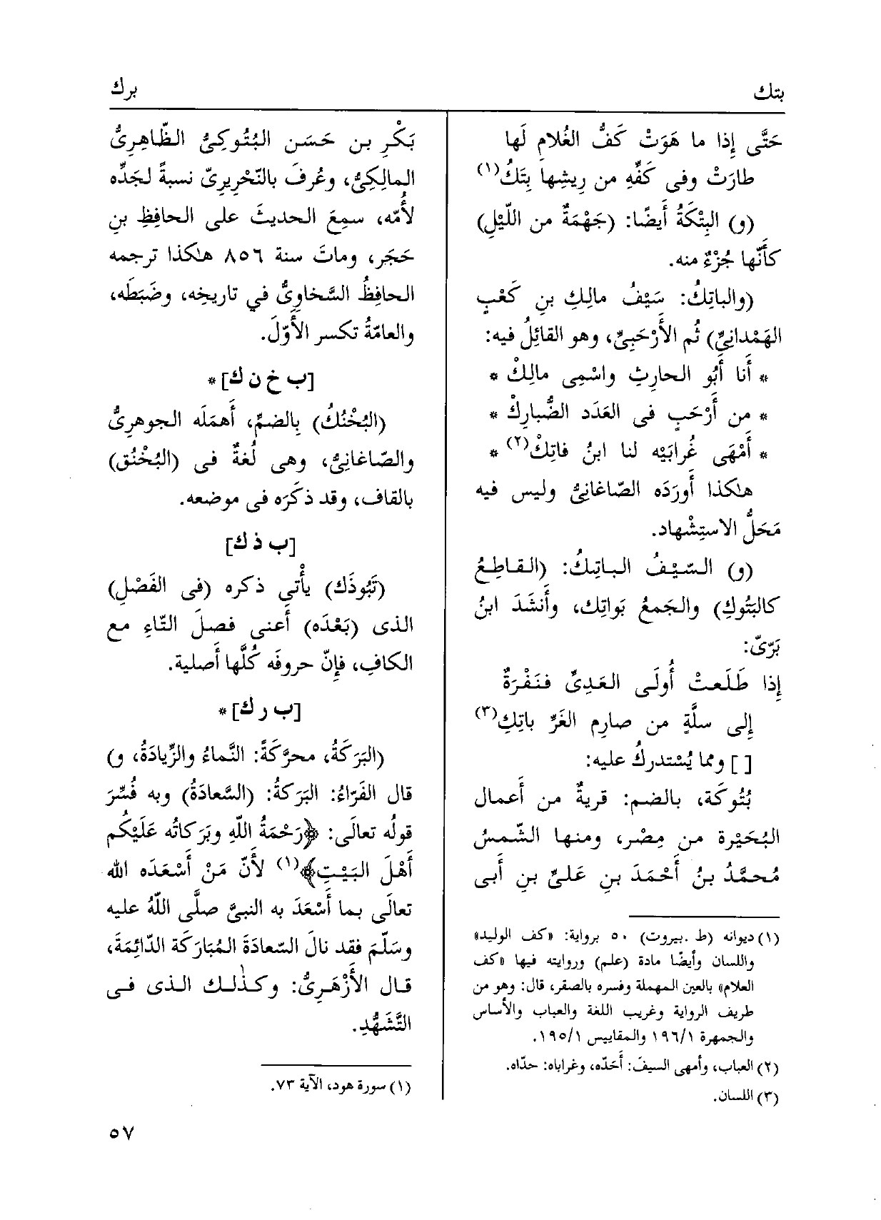والبِتْكَةُ أَيْضا: جَهْمَةٌ من اللّيلِ كَأَنَّهَا جُزْءٌ مِنْهُ. والباتِكُ: سَيفُ مالِكِ بنِ كَعْبٍ الهَمْدانيِّ ثُم الأَرْحَبِيِّ، وَهُوَ القائِلُ فِيهِ: أَنا أَبُو الحارِثِ واسْمِي مالِكْ من أَرحَبٍ فِي العَدَد الضُّبارِكْ أَمْهَى غُرابَيه لنا ابنُ فاتِكْ هَكَذَا أَورَدَه الصّاغانيُ وَلَيْسَ فِيهِ مَحَلُّ الاستِشْهاد. والسّيفُ الباتِكُ: القاطِعُ كالبتُوكِ والجَمعُ بَواتِك، وأَنشَدَ ابنُ بَري:
