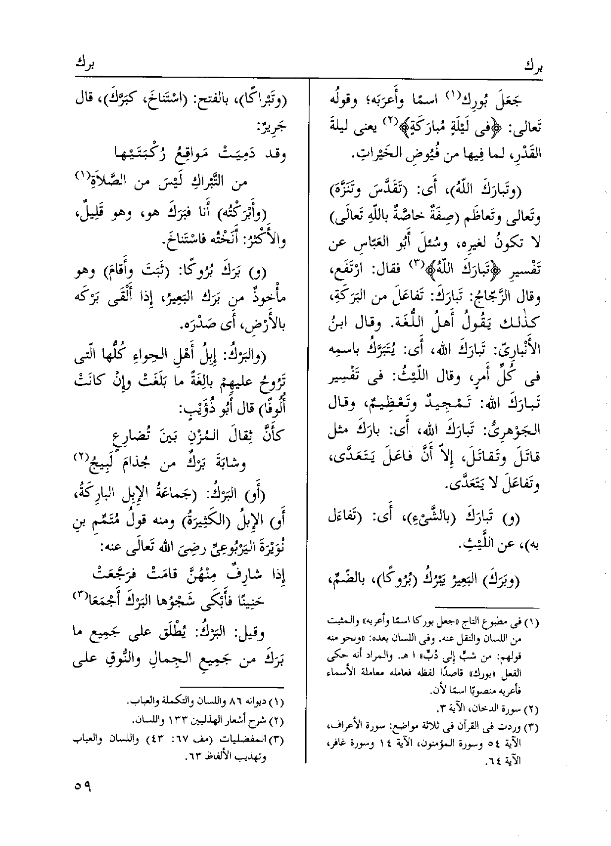 اللهُ، أَي: تَقَدَّسَ وتَنَزَّهَ وتَعالى وتَعاظَم صِفَةٌ خاصَّةٌ باللهِ تَعالَى لَا تكونُ لغيرِه، وسُئلَ أَبُو العَبّاسِ عَن تَفْسيرِ تَبارَكَ اللهُ فَقَالَ: ارْتَفَع، وَقَالَ الزَّجّاجُ: تَبارَكَ: تَفاعَلَ من البَرَكَةِ، كَذَلِك يَقولُ أَهلُ اللُّغَة. وَقَالَ ابنُ الأَنْبارِيّ: تَبارَكَ الله، أَي: يُتَبَرَّكُ باسمِه فِي كُلِّ أَمرٍ، وَقَالَ اللّيثُ: فِي تَفْسِير تَبارَكَ الله: تَمجِيدٌ وتَعْظِيمٌ، وَقَالَ الجَوهرِيُّ: تَبارَكَ الله، أَي: بارَكَ مثل قاتَلَ وتَقاتَلَ، إِلاّ أَنَّ فاعَلَ يَتَعَدَّى، وتَفاعَلَ لَا يَتَعَدَّى. وتَبارَكَ بالشَّيءِ، أَي: تَفاءَل بِهِ، عَن اللَّيْثِ.