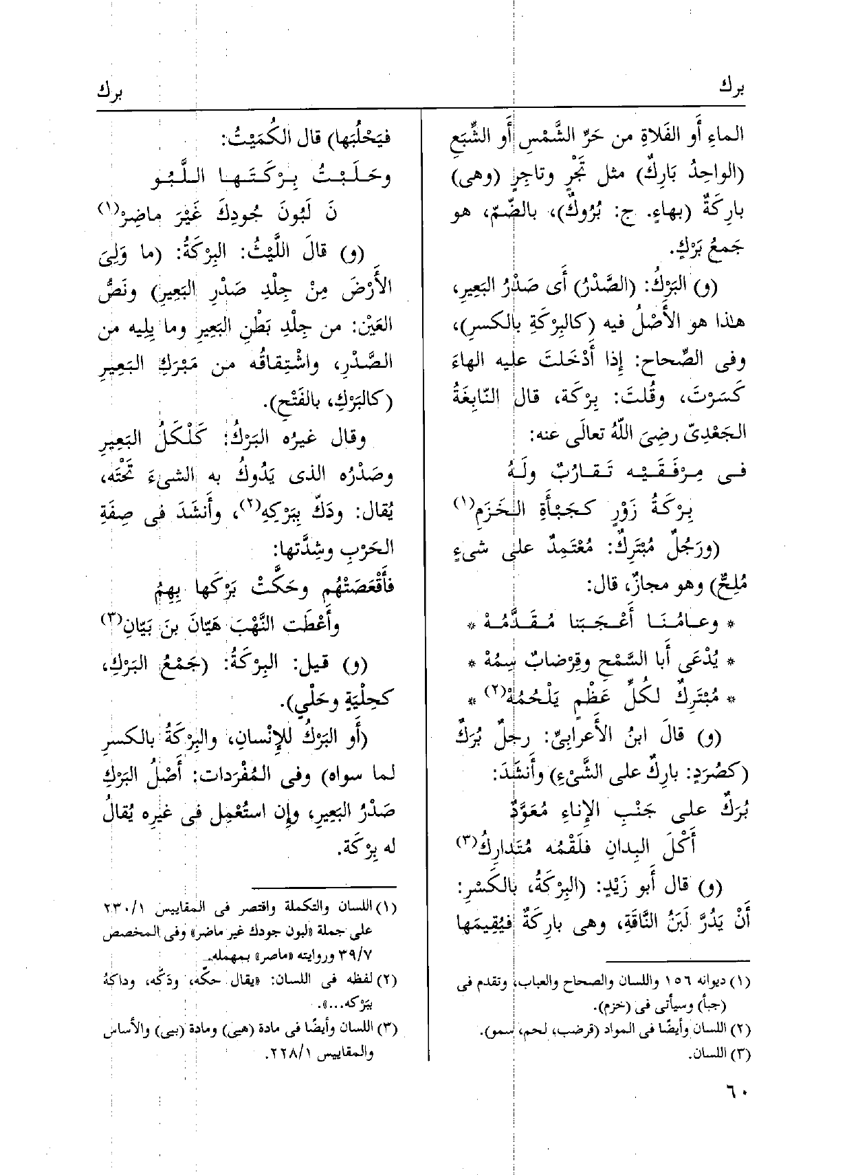 الماءِ أَو الفَلاةِ من حَرِّ الشَّمْسِ أَو الشِّبَعِ الواحِدُ بَارِكٌ مثل تَجْرٍ وتاجِرٍ وَهِي بارِكَةٌ بهاءٍ. بُرُوكٌ، بالضّمّ، هُوَ جَمعُ بَرك. والبَرِكُ: الصَّدْرُ أَي صَدْرُ البَعِيرِ، هَذَا هُوَ الأصْلُ فِيهِ كالبِركَة بالكسرِ، وَفِي الصِّحاح: إِذا أَدْخَلتَ عَلَيْهِ الهاءَ كَسَرتَ، وقُلتَ: بِركَة، قَالَ النّابِغَةُ الجَعْدِيّ رَضِي اللهُ تعالَى عَنهُ: