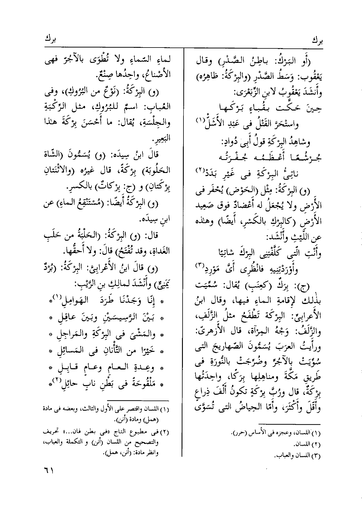 بِرَكٌ كعِنَب يُقال: سُمِّيَت بذلك لإِقامةِ الماءِ فِيهَا، وَقَالَ ابنُ الْأَعرَابِي: البِركَة تَطْفَحُ مثلُ الزَّلَفِ، والزَّلَفُ: وَجْهُ المِرآة، قَالَ الأَزهريّ ورأَيتُ العرَبَ يُسَمُّونَ الصّهاريجَ الَّتِي سُوِّيَتْ بالآجُرِّ وضُرِّجَتْ بالنُّورَةِ فِي طَريقِ مَكَّةَ ومناهِلِها بِرَكاً، واحِدَتُها بِركَةٌ، قَالَ ورُبَّ بِركَةٍ تكونُ أَلْفَ ذِراع وأَقّلَ وأَكْثَرَ، وأَمّا الحِياضُ الَّتِي تُسَوَّى لماءِ السّماءِ وَلَا تُطْوَى بالآجُرّ فَهِيَ الأصْناعُ، واحِدُها صِنْعٌ. والبِركَةُ: نَوْعٌ من البُرُوكِ، وَفِي العُبابِ: اسمٌ للبُرُوكِ، مثل الرِّكْبَةِ والجِلْسَةِ، يُقال: مَا أَحْسَنَ بِركَةَ هَذَا البَعِيرِ. قالَ ابنُ سِيدَه: ويُسَمُّونَ الشّاة الحَلُوبَة بِركَةً، قَالَ غيرُه والاثْنَتانِ بِركَتانِ وبِركاتٌ بالكسرِ. والبِركَةُ أَيْضا: مُستَنْقِعُ الماءِ عَن ابنِ سِيدَه.