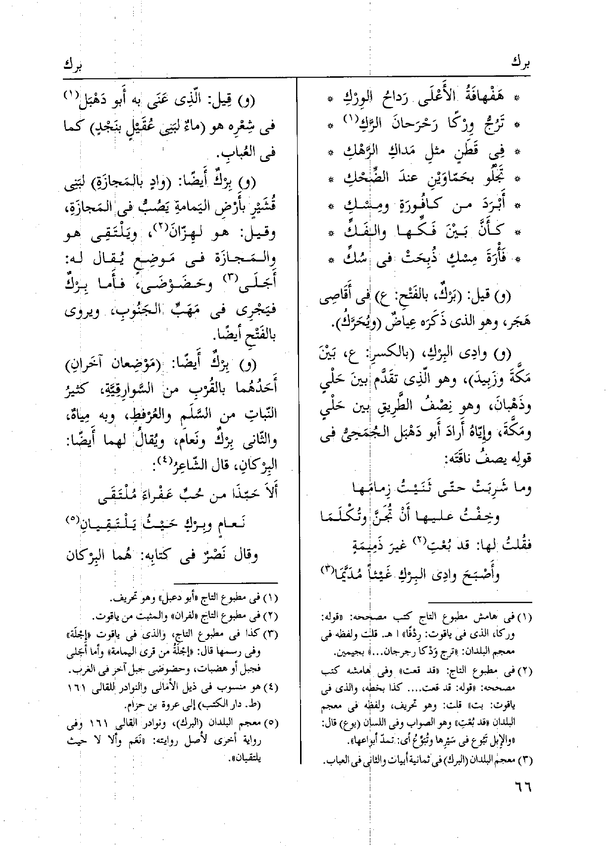 هَفْهافَةُ الأعْلَى رَداحُ الوِرْكِ تَرُجو وِرْكاً رَحْرَحانَ الرَكِ فِي قَطَنِ مثلِ مَداكِ الرَهْكِ تَجلو بحَمّاوَيْنِ عندَ الضِّحْكِ أَبْرَدَ من كافُورَة ومِسْكِ كأنَّ بَيْنَ فَكِّها والفَكِّ فَأْرَةَ مِسْك ذُبِحَتْ فِي سُكِّ وَقيل: بَرك، بالفَتْحِ: فِي أَقَاصِي هَجَر، وَهُوَ الَّذِي ذَكَرَه عِياضٌ ويُحَرَّكُ. ووادِي البِركِ، بالكسرِ: بَيْنَ مَكَّةَ وزَبِيدَ، وَهُوَ الَّذِي تقَدَّم بينَ حَلْيِ وذَهْبانَ، وَهُوَ نِصْفُ الطَّرِيقِ بَين حَلْيٍ ومَكَّةَ، وإِيّاهُ أَرادَ أَبو دَهْبَل الجمَحِيُّ فِي قولِه)