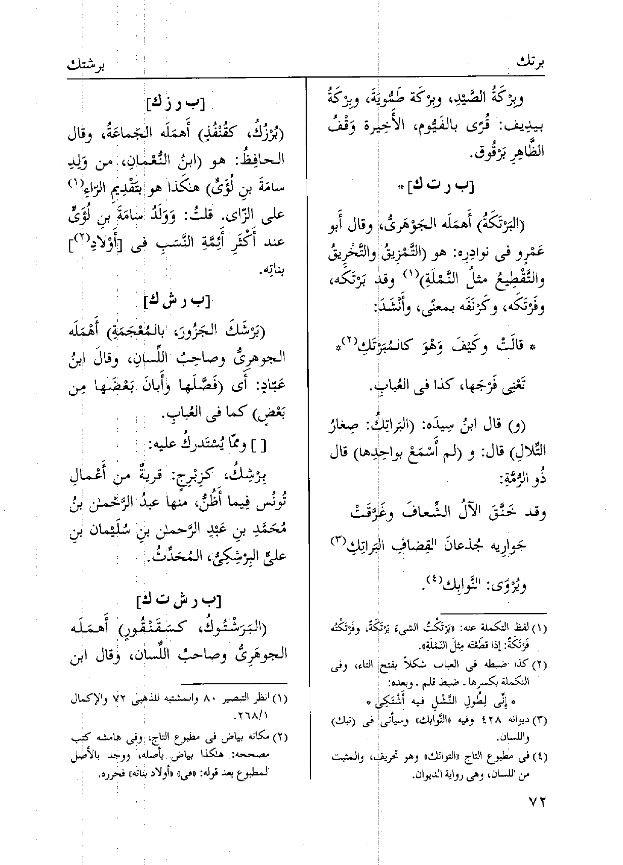 البَرتَكَةُ أَهمَلَه الجَوْهَريُّ، وَقَالَ أَبو عَمْرٍ وَفِي نوادِرِه: هُوَ التَّمْزِيقُ والتَّخْرِيقُ والتَّقْطِيعُ مثلُ النَّمْلَةِ وَقد بَرتَكَه، وفَرتَكَه، وكَرنَفَه بِمَعْنى، وأَنْشَدَ: قالَتْ وكَثفَ وَهْوَ كالمُبَرتَكِ تَعْني فَرجَها، كَذَا فِي العُبابِ. وَقَالَ ابنُ سِيدَه: البَراتِكُ: صِغارُ التِّلالِ قَالَ: وَلم أَسْمَعْ بواحِدِها قَالَ ذُو الرُمَةِ: