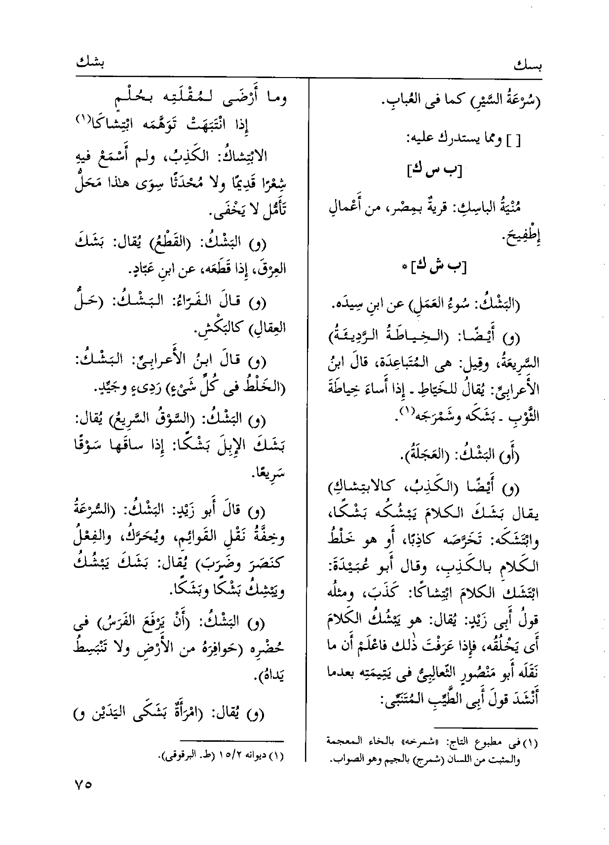 وَأَيْضًا الكَذِبُ، كالابتِشاكِ يُقَال بَشَكَ الكلامَ يَبشُكُه بَشْكاً، وابْتَشَكَه: تَخَرَّصَه كاذِباً، أَو هُوَ خَلْطُ الكَلامِ بالكَذِبِ، وَقَالَ أَبو عُبَيدَةَ: ابتَشَك الكلامَ ابْتِشاكاً: كَذَبَ، ومثلُه قولُ أبي زَيد: يُقال: هُوَ يَبشُكُ الكَلامَ أَي يَخْلُقُه، فإِذا عَرَفْتَ ذَلِك فاعْلم أَن مَا نَقَلَه أَبو مَنْصُورٍ الثّعالِبِيُ فِي يَتِيمَتِه بَعْدَمَا أَنْشَدَ قولَ أبي الطَّيِّبِ المُتَنبي: