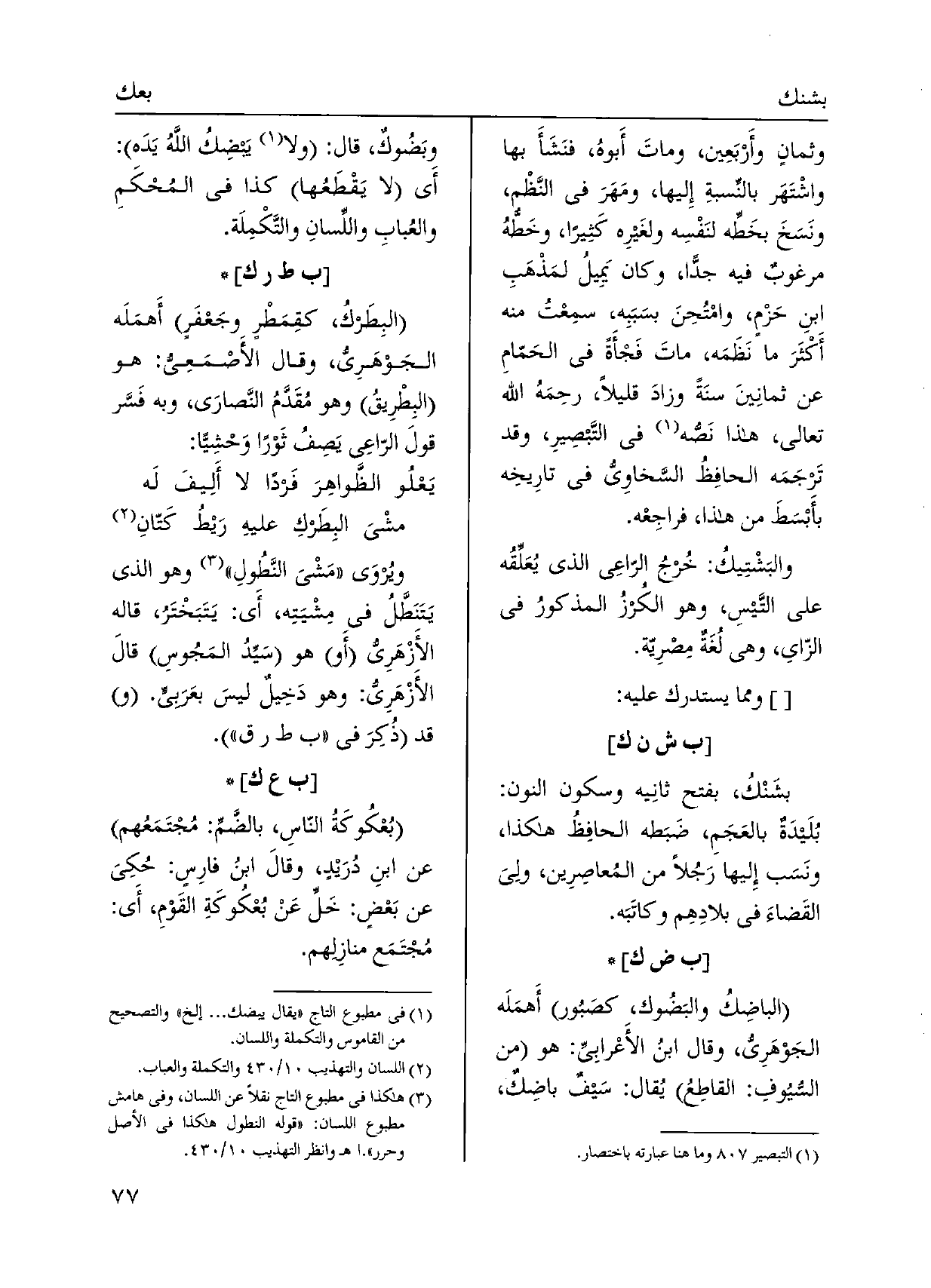 وثمانٍ وأَرْبَعِين، وماتَ أَبوهُ، فنَشَأَ بهَا واشْتَهَر بالنِّسبةِ إِليها، ومَهَرَ فِي النَّظْم، ونَسَخَ بخَطِّه لنَفْسِه ولغَيرِه كَثِيراً، وخَطّهُ مرغوبٌ فِيهِ جدًّاً، وَكَانَ يَمِيلُ لمَذْهَبِ ابنِ حَزْمِ، وامْتُحِنَ بسَبَبِه، سمِعْتُ مِنْهُ أَكْثَرَ مَا نَظَمَه، ماتَ فَجْأَةً فِي الحَمّامِ عَن ثمانِينَ سنَةً وزادَ قَلِيلا، رحِمَهُ الله تَعَالَى، هَذَا نَصّه فِي التّبصِيرِ، وَقد تَرجَمَه الحافِظُ السَّخاوِيّ فِي تارِيخِه بأَبْسَطَ من هَذَا، فراجِعْه. والبَشْتِيكُ: خُرجُ الرّاعِي الَّذِي يُعَلِّقُه على التَّيسِ، وَهُوَ الكُرزُ المذكورُ فِي الزّاي، وَهِي لُغَةٌ مِصْرِيّة.