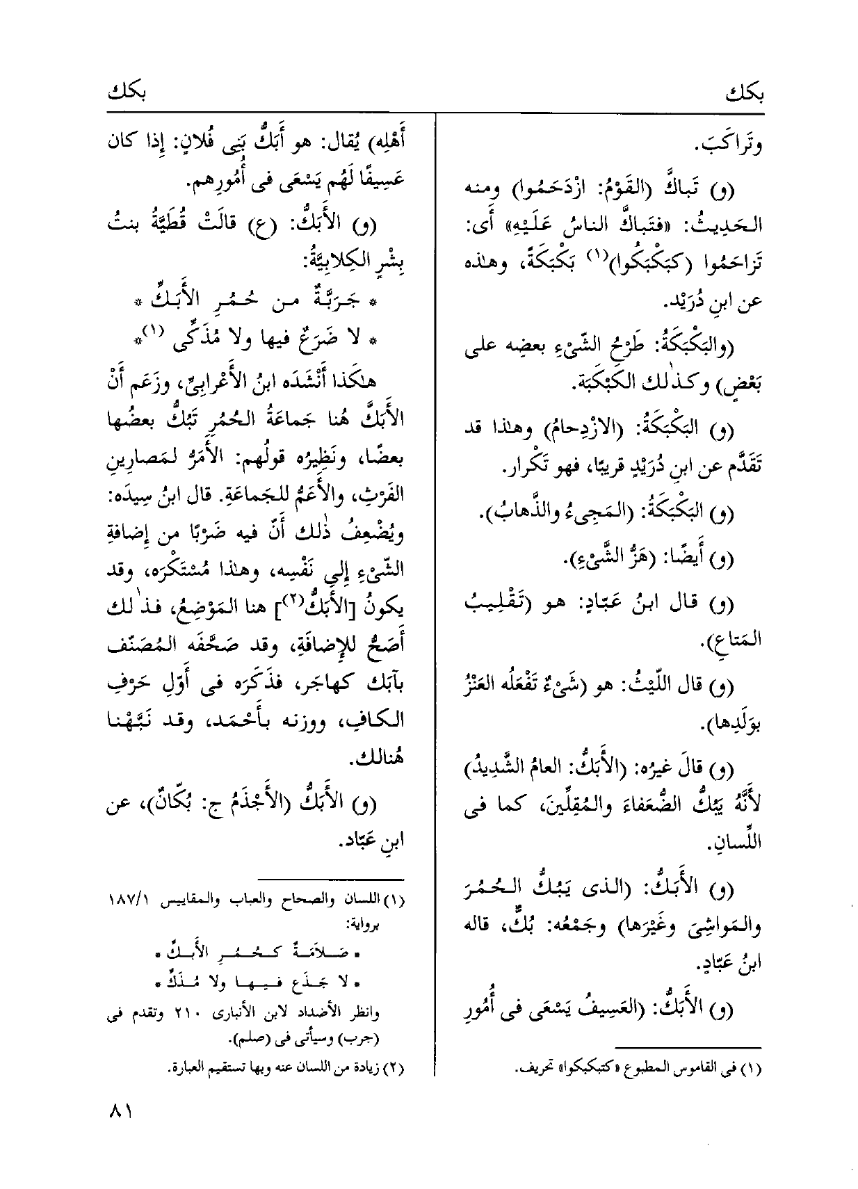 والأَبَكُّ: العَسِيفُ يَسعَى فِي أُمُورِ أَهْلِه يُقال: هُوَ} أَبَكّ بني فُلان: إِذا كَانَ عَسِيفاً لَهُم يَسعَى فِي أمُورِهم. والأَبَكُّ: قالَتْ قُطَيَّةُ بنت بِشْرٍ الكِلابِيَّةُ: جَرَبَّةٌ من حُمُرِ الأَبَكِّ لَا ضَرَعٌ فِيهَا وَلَا مُذَكِّى هكَذا أَنْشَدَه ابنُ الْأَعرَابِي، وزَعَم أَنْ الأَبَكَّ هُنا جَماعَةُ الحُمُرِ {تَبُكُّ بعضُها بَعْضًا، ونَظِيره قولُهم: الأَمَرّ لمَصارِينِ الفَرثِ، والأَعَمُّ للجَماعَةِ. قَالَ ابنُ سِيدَه: ويُضْعِفُ ذَلِك أَنّ فِيهِ ضَرباً من إِضافةِ الشّيءِ إِلىِ نَفْسِه، وَهَذَا مُستَكْرَه، وَقد يكون الأبَكّ، هُنَا المَوْضِعُ، فَذَلِك أَصَحُّ للإِضافَةِ، وَقد صَحَّفَه المُصَنّف بآبَك كهاجَر، فذَكَرَه فِي أَوّلِ حَرفِ الكافِ، ووزنه بأَحْمَد، وَقد نَبَّهْنا هُنالك. والأَبَكُّ الأَجْذَمُ} بُكّانٌ، عَن ابنِ عَبّاد.