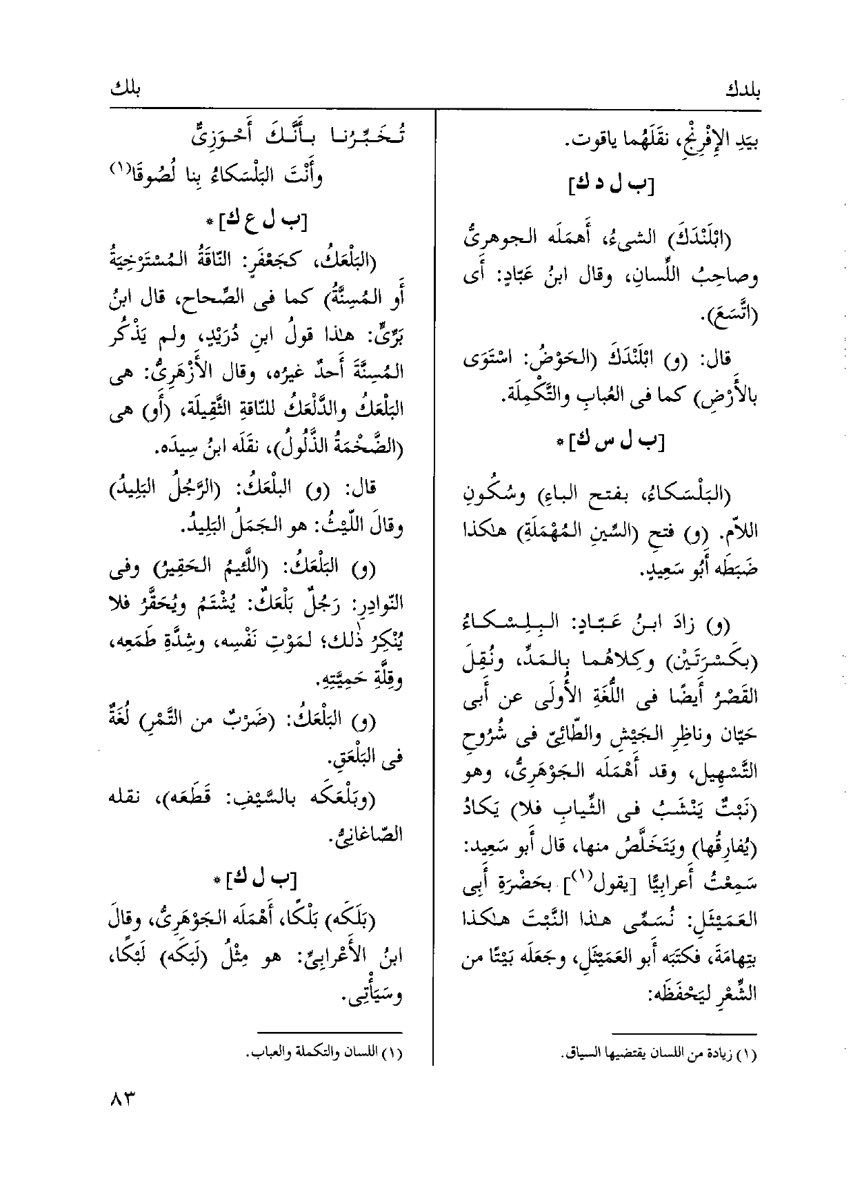 البَلْعَكُ، كجَعْفَرٍ: النّاقَةُ المُستَرخِيَةُ أَو المُسِنَّةُ كَمَا فِي الصِّحاح، قَالَ ابنُ بَرّي: هَذَا قولُ ابنِ دُرَيْدٍ، وَلم يَذْكُر المُسِنَّةَ أَحدٌ غيرُه، وَقَالَ الأَزْهَرِيُّ: هِيَ البَلْعَكُ والدَّلْعَكُ للنّاقةِ الثَّقِيلَة، أَو هِيَ الضَّخْمَةُ الذَّلُولُ، نقَلَه ابنُ سِيدَه. قَالَ: والبلْعَكُ: الرَّجُلُ البَلِيدُ وقالَ اللّيث: هُوَ الجَمَلُ البَلِيدُ.