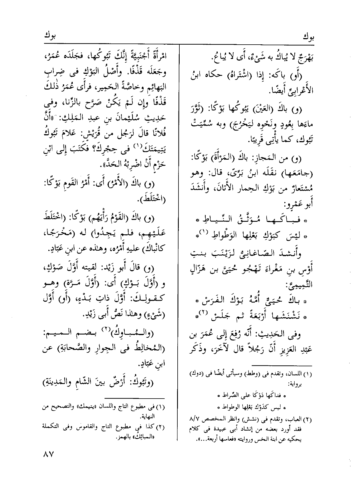 وجَعَلَه قَذْفاً. وأَصْلُ} البَوْكِ فِي ضِرابِ البَهائِمِ وخاصَّةً الحَمِير، فرأي عُمَرُ ذلكَ قَذْفاً وإِن لَم يَكُنْ صَرَّح بالزِّنا، وَفِي حَدِيثِ سُلَيمانَ بنِ عبدِ المَلِكِ: أَنَّ فُلاناً قالَ لرَجُل من قُرَيْشٍ: عَلامَ تَبُوكُ يَتِيمَتَكَ فِي حِجْرِكَ فكَتَبَ إِلى ابْنِ حَزْمٍ أَنْ اضْرِبْهُ الحَدَّ. وباكَ الأَمْرُ أَي: أَمْرُ القَومِ {بَوْكاً: اخْتَلَطَ. وباكَ القَوْمُ رَأْيَهُم بَوْكاً: اخْتَلَطَ عَلَيهِم، فلمِ يَجِدُوا لَهُ مَخْرَجاً، كانْباكَ عليهِ أمْرُه، وَهَذِه عَن ابنِ عَبّاب. وقالَ أَبو زَيْد: لَقيته أَوَّلَ صَوْكٍ، وأَوَّلَ} بَوْكٍ أَي: أَوَّلَ مَرَّة وَهُوَ كقولِكَ: أَوَّلَ ذاتِ بَدْءٍ، أَو أَوَّل شَيءٍ وَهَذَا نَصُّ أبي زَيْدٍ. {والمُباوِكُ بِضَم الْمِيم: المُخالِطُ فِي الجِوارِ والصَّحابَةِ عَن ابنِ عَبّاد.} وتَبُوك: أَرْضٌ بينَ الشّامِ والمَدِينَةِ