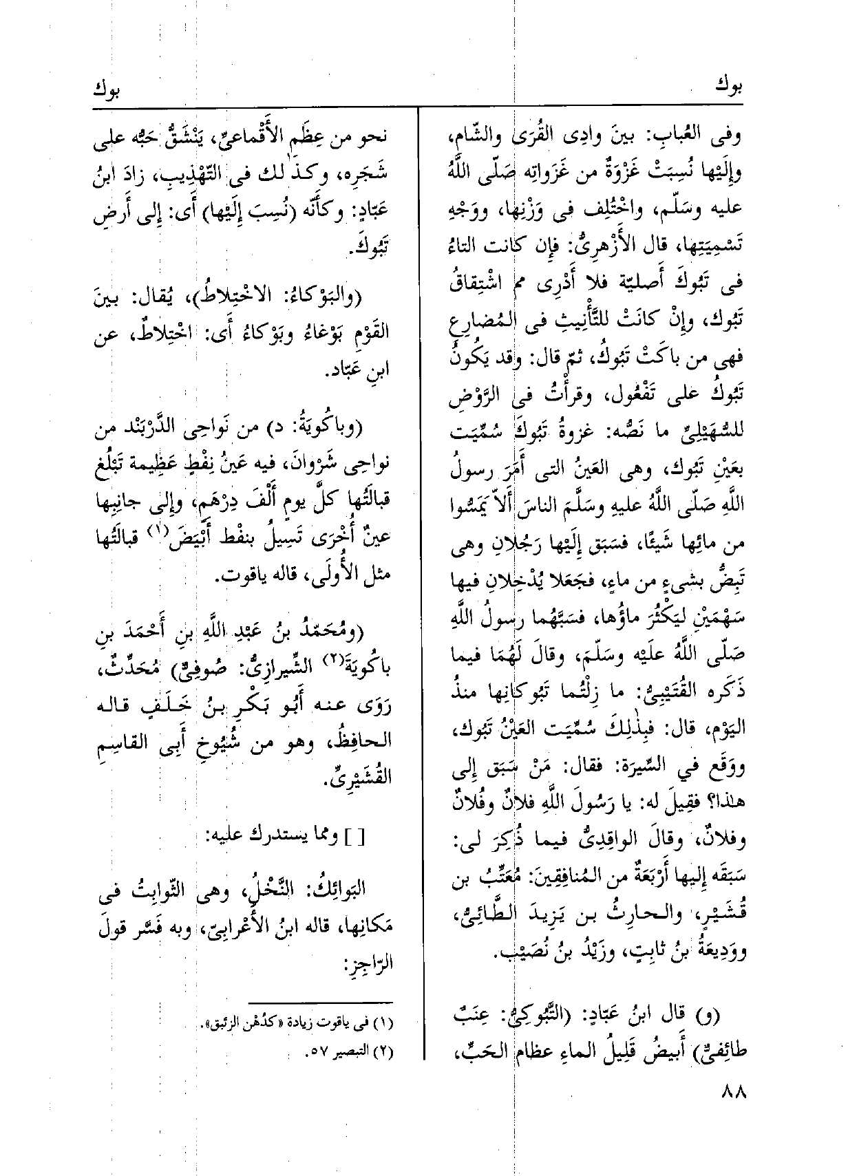 وَفِي العُبابِ: بينَ وادِي القُرَى والشّام، وإِلَيها نُسِبَتْ غَزْوَةٌ من غَزَواتِه صَلّى اللَّهُ عَلَيْهِ وسَلّم، واخْتُلِف فِي وَزْنِها، ووَجْهِ تَسمِيَتِها، قَالَ الأَزْهرِيُّ: فإِن كَانَت التاءُ فِي تَبُوكَ أَصليّة فَلَا أَدْرِي مِم اشْتِقاقُ تَبُوك، وِإنْ كانَتْ للتَّأْنِيثِ فِي المُضارِعِ فَهِيَ من {باكَتْ تَبُوكُ، ثمّ قَالَ: وَقد يَكُونُ تَبُوكُ على تَفْعُول، وقرأْتُ فِي الرَوْضِ للسُّهَيلِيِّ مَا نَصُّه: غزوةُ تَبُوكَ سُمَيَت بعَيْنِ تَبُوك، وَهِي العَينُ الَّتِي أَمَرَ رسولُ اللَّهِ صَلّى اللَّهُ عليهِ وسَلَّمَ الناسَ أَلاّ يَمَسُّوا من مائِها شَيئاً، فسَبَق إِلَيها رَجُلانِ وَهِي تَبِضُّ بشيءٍ من ماءٍ، فجَعَلا يُدْخِلانِ فِيهَا سَهْمَيْنِ ليَكْثُرَ مَاؤُهَا، فسَبَّهُما رَسُول اللَّهِ صَلّى اللَّهُ علَيه وسَلّمَ، وقالَ لَهُمَا فِيمَا ذَكَره القُتَبِيُ: مَا زِلْتُما تَبُوكانِها منذُ اليَوْم، قَالَ: فبِذلِكَ سُمِّيَت العَيْنُ تَبُوك، ووَقَع فِي السِّيرَة: فَقَالَ: مَنْ سَبَق إِلى هَذَا فقِيلَ لَهُ: يَا رَسُولَ اللَّهِ فلانٌ وفُلانٌ وفلانٌ، وقالَ الواقِدِيُّ فِيمَا ذُكِرَ لي: سَبَقَه إِليها أَرْبَعَةٌ من المُنافِقِينَ: مُعَتِّبُ بن قُشيرٍ، والحارِثُ بن يَزِيدَ الطَّائِيُ، ووَدِيعَةُ بنُ ثابِتٍ، وزَيْدُ بنُ نُصَيب. وَقَالَ ابنُ عَبّادٍ:} - التَّبُوكِيُّ: عِنَبٌ طائِفي أَبيضُ قَلِيلُ الماءِ عِظَام الحَبِّ، نَحْو من عِظَمِ الأقْماعي، يَنْشَقُّ حَبُّه على شَجَرِه، وَكَذَلِكَ فِي التّهْذِيب، زادَ ابنُ عَبّادٍ: وَكَأَنَّهُ نُجَا إِلَيها أَي: إِلى أَرضِ تَبُوكَ. {والبَوْكاء: الاخْتِلاطُ، يُقال: بينَ القَوْمِ بَوغاءُ وبوكاءُ أَي: اخْتِلاطٌ، عَن ابنِ عَبّاد.} وباكُويَةُ: من نَواحِي الدَّرْبَنْد من نواحِي شَروانَ، فِيهِ عَينُ نِفْط عَظِيمة تَبلُغ قبالَتُها كلَّ يومٍ أَلْفَ دِرْهَم، وِإلى جانِبِها عينٌ أخْرَى تَسِيلُ بنفْط أبْيَضَ قبالَتُها مثل الأُولَى، قَالَه ياقوت. ومُحَمّدُ بنُ عَبدِ اللَّهِ بنِ أَحْمَدَ بنِ {باكُويَةَ الشِّيرازِيُّ: صُوفِيٌ مُحَدِّثٌ، رَوَى عَنهُ أَبُو بَكْرِ بنُ خَلَفٍ قَالَه الحافِظُ، وَهُوَ من شيُوخِ أبي القاسِمِ القُشَيرِيِّ.