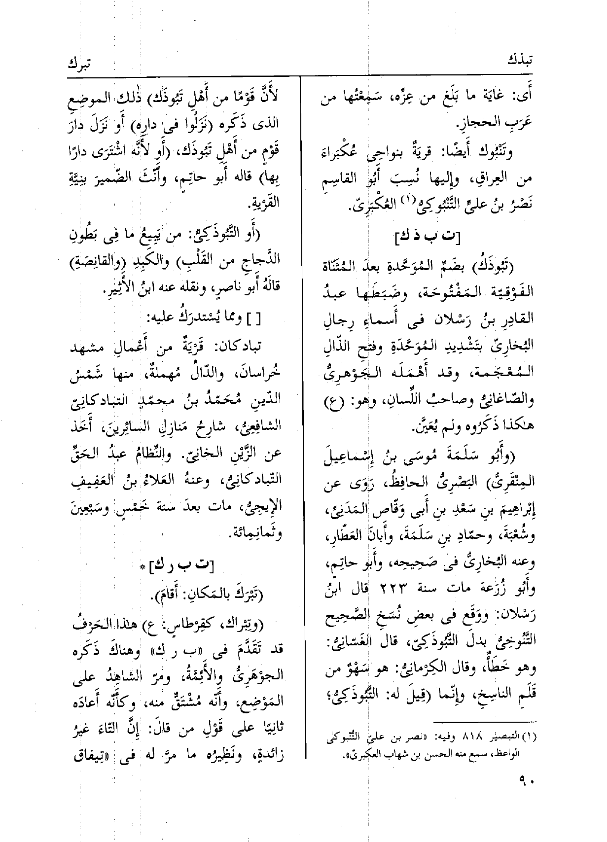 وَمِمَّا يُستدرَكُ عَلَيْهِ: تبادكان: قَريَةٌ من أَعْمالِ مشْهد خُراسانَ، والدّالُ مُهملةٌ، مِنْهَا شَمْسُ الدّينِ مُحَمّدُ بنُ محمّدٍ التبادكانِي الشافِعِيُّ، شارِحُ مَنازِلِ السائِرينَ، أَخَذ عَن الزَّيْنِ الخاني. والنِّظامُ عبدُ الحَقِّ التّبادكانِيُ، وعنهُ العَلاءُ بنُ العَفِيفِ الإِيجِيُّ، مَاتَ بعدَ سنة خمسٍ وسبعِينَ وثَمانِمِائة.