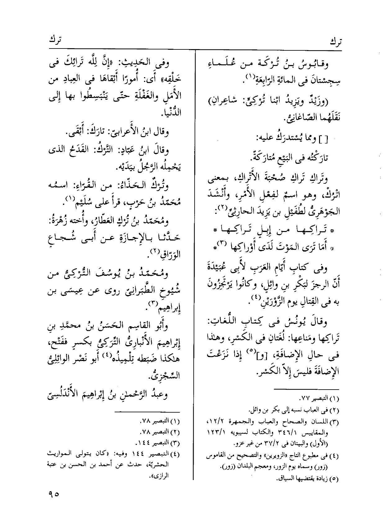 وَمِمَّا يُستدرَكُ عَلَيْهِ: تارَكْتُه فِي البَيعِ مُتارَكَةً. وتَراكِ تَراكِ صُحْبَةَ الأَتْرِاكِ، بِمَعْنى اتْرُكْ، وَهُوَ اسمٌ لفِعْلِ الأمْرِ، وأَنْشَدَ الجَوْهَرِيُّ لطُفَيل بن يَزِيدَ الحارثيِّ: تَراكِها من إِبِلٍ تَراكِها أَمَا تَرَى المَوْتَ لَدَى أَوْراكِها وَفِي كتابِ أَيّامِ العَرَبِ لأبي عُبَيدَةَ أَنّ الرجزَ لبَكْرِ بنِ وائِلٍ، وكانُوا يَرتَجِزُونَ بِهِ فِي القِتالِ يَوْم الزَّوْرَيْنِ. وقالَ يُونُسُ فِي كِتابِ اللُّغاتِ: تَراكِها ومَناعِها: لُغَتانِ فِي الْكسر، وَهَذَا فِي حالِ الإِضافَةِ، وإِذا نَزَعْتَ الإضافَةَ فليسَ، إلاّ الْكسر. وَفِي الحَدِيثِ: إِنَّ لِلَّه تَرائِكَ فِي خَلْقِه أَي: أموراً أَبْقاهَا فِي العِبادِ من الأَمَلِ والغَفْلَةِ حتّى يَنْبَسِطُوا بهَا إِلى الدُّنْيا. وَقَالَ ابنُ الأَعرابي: تارَكَ: أَبْقَى. وقالَ ابنُ عَبّادٍ: التَّركُ: القَدَحُ الَّذِي يَحْمِلُه الرَّجُلُ بيَدَيْه. وتُركٌ الحَذّاءُ: من القُرّاءِ: اسمُه مُحَمّدُ بنُ حَربٍ، قرأَ على سُلَيم. ومُحَمّدُ بنُ تُركٍ العَطّارُ، وأُخته زُهْرَةُ: حَدَّثا بالإِجازَةِ عَن أبي شُجاعٍ الوَراقِ. ومُحَمّدُ بنُ يُوسُفَ التُّركِيُ من شُيُوخِ الطَّبَرانِي روى عَن عِيسَى بن إِبراهِيم. وأَبُو القاسِم الحَسَنُ بنُ محمَّدِ بنِ إبْراهِيمَ الأَنْبارِيُّ التِّرَكِيُ بكسرٍ ففَتْح، هَكذا ضَبَطه تِلْمِيذُه أَبو نَصْر الوائِلِيُ السِّجْزِيّ. وَعبد الرَّحْمنِ بنُ) إِبْراهِيمَ الأَنْدَلُسِي
