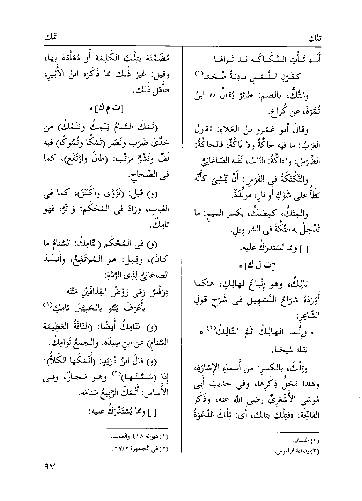 تالِك، وَهُوَ إِتْباعٌ لهالِكٍ، هَكَذَا أَوْرَدَهُ شرّاحُ التَّسْهِيلِ فِي شَرحِ قولِ الشّاعِرِ: وإِنَّما الهالِكُ ثَمَّ التّالِكُ نَقله شَيخنَا. وتِلْكَ، بالكسرِ: من أَسماءِ الإِشارَةِ، وَهَذَا مَحَلُّ ذِكْرِها، وَفِي حديثِ أبي مُوسَىِ الأَشْعَريِّ رَضِي الله عَنهُ، وذَكَر الفاتِحة: فتِلْك بِتِلْكَ، أَي: تِلْكَ الدّعْوَةُ مُضَمَّنَة بتِلْك الكَلِمَة أَو مُعَلَّقة بهَا، وَقيل: غيرُ ذَلِك مِمَّا ذكره ابنُ الأَثِيرِ، فتأَمّل ذَلِك.