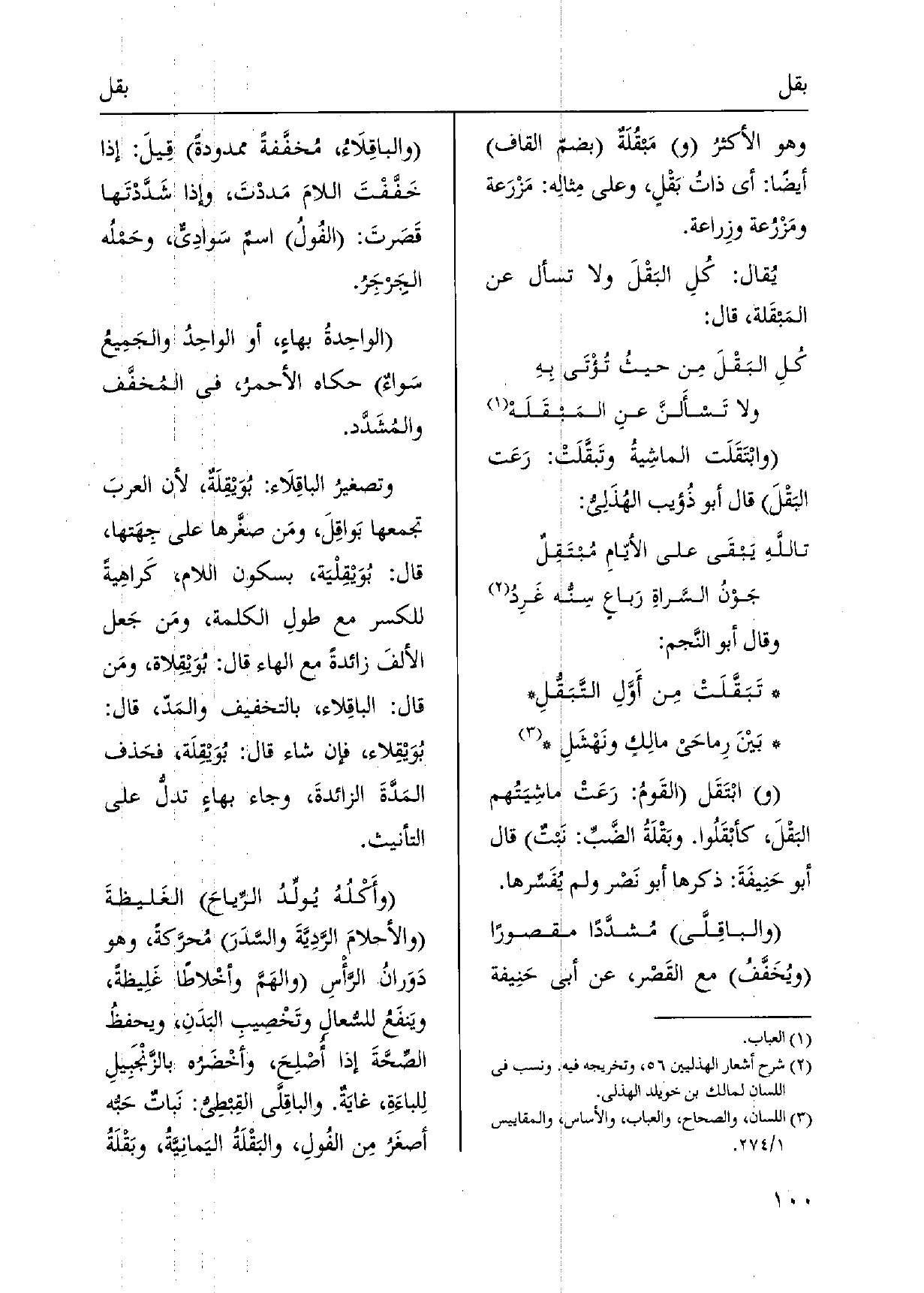 وَقَالَ أَبُو النَّجم: تَبَقَّلَتْ مِن أَوَّلِ التَّبَقُّلِ بَين رِماحَىْ مالِكٍ ونَهْشَلِ ابْتَقَل القَومُ: رَعَتْ ماشِيَتُهم البَقْلَ، كأبْقَلُوا. وبَقْلَةُ الضَّبِّ: نَبتٌ قَالَ أَبُو حَنِيفَةَ: ذكرهَا أَبُو نَصْر وَلم يُفَسِّرها. والباقِلَّي مُشدَّداً مَقْصُورا ويُخَفَّفُ مَعَ القَصْر، عَن أبي حَنِيفة والباقِلَاءُ، مُخفَّفةً ممدودةً قِيلَ: إِذا خَفَّفْتَ اللامَ مَددْتَ، وَإِذا شَدَّدْتَها قَصَرتَ: الفُولُ اسمٌ سَوادِيٌّ، وحَمْلُه الجِرْجَرُ.