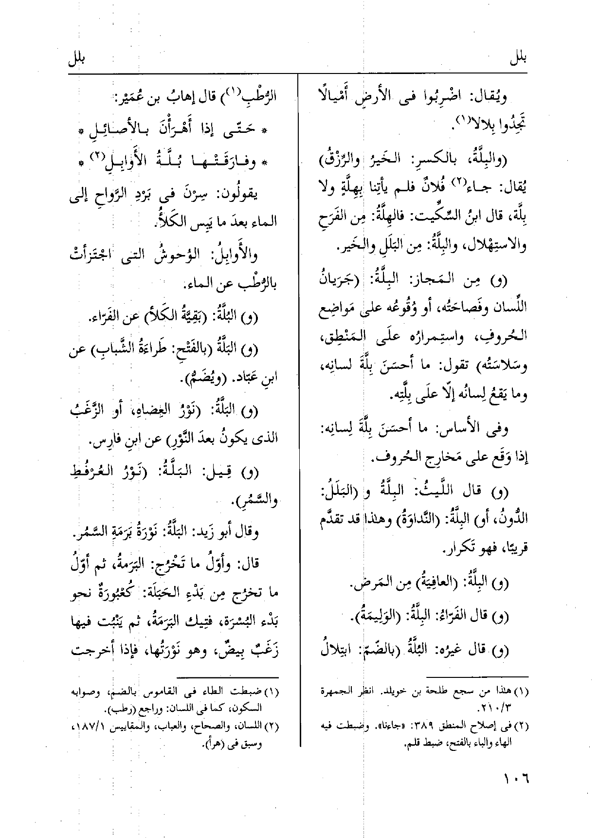 وَفِي الأساس: مَا أحسَنَ بِلَّةَ لِسانِه: إِذا وَقَع على مَخارِج الْحُرُوف. قَالَ اللَّيثُ: {البِلَّةُ و} البَلَلُ: الدُّونُ، أَو {البِلَّةُ: النَّداوَةُ وَهَذَا قد تقدَّم قَرِيبا، فَهُوَ تَكرار. (و) } البِلَّةُ: العافِيَةُ مِن المَرض. قَالَ الفَرّاءُ: البِلَّةُ: الوَلِيمَةُ. قَالَ غيرُه: {البُلَّةُ بالضّمّ: ابتِلالُ الرُّطْبِ قَالَ إهابُ بن عُمَير: حَتّى إِذا أَهْرَأْنَ بالأصائِلِ وفارَقَتْها} بُلَّةُ الأَوابِلِ يقولُون: سِرنَ فِي بَردِ الرَّواحِ إِلَى المَاء بعدَ مَا يَبِس الكَلأُ. والأَوابِلُ: الوُحوشُ الَّتِي اجْتَزأتْ بالرُّطْب عَن المَاء. (و) {البُلَّةُ: بَقِيَّةُ الكَلأ عَن الفَرّاء. (و) } البَلَّةُ بالفَتْحِ: طَراءَةُ الشَّبابِ عَن ابنِ عَبّاد.