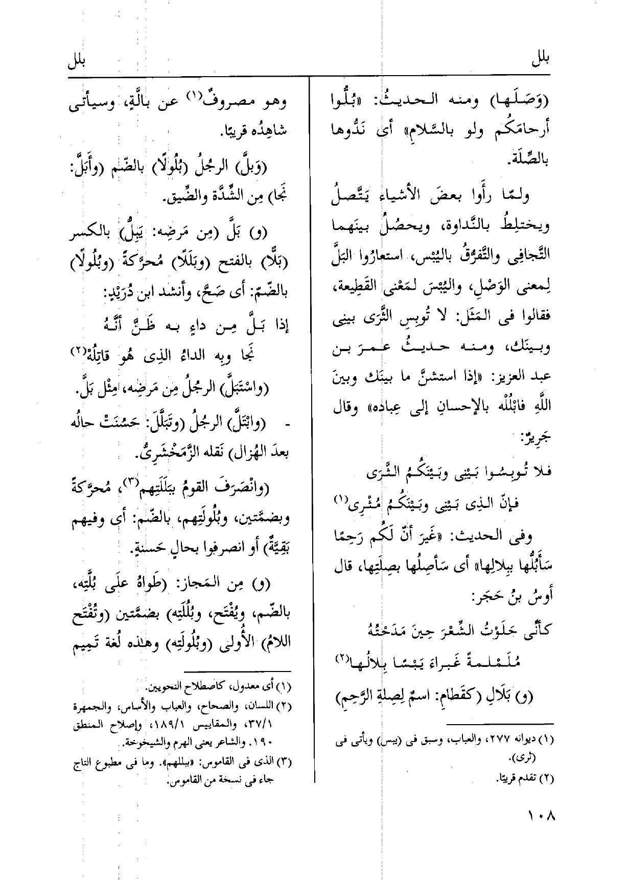 (و) {بَلالِ كقَطامِ: اسمٌ لِصِلةِ الرَّحِمِ وَهُوَ مصروفٌ عَن} بالَّةٍ، وَسَيَأْتِي شاهِدُ قَرِيبا. {وَبلَّ الرجُلُ} بُلُولاً بالضّم {وأَبَلَّ: نَجا مِن الشِّدَّة والضِّيق. وبَلَّ مِن مَرضِه:} يَبِلُّ بِالْكَسْرِ {بَلّاً بِالْفَتْح} وبَلَلاً مُحرَّكةً)