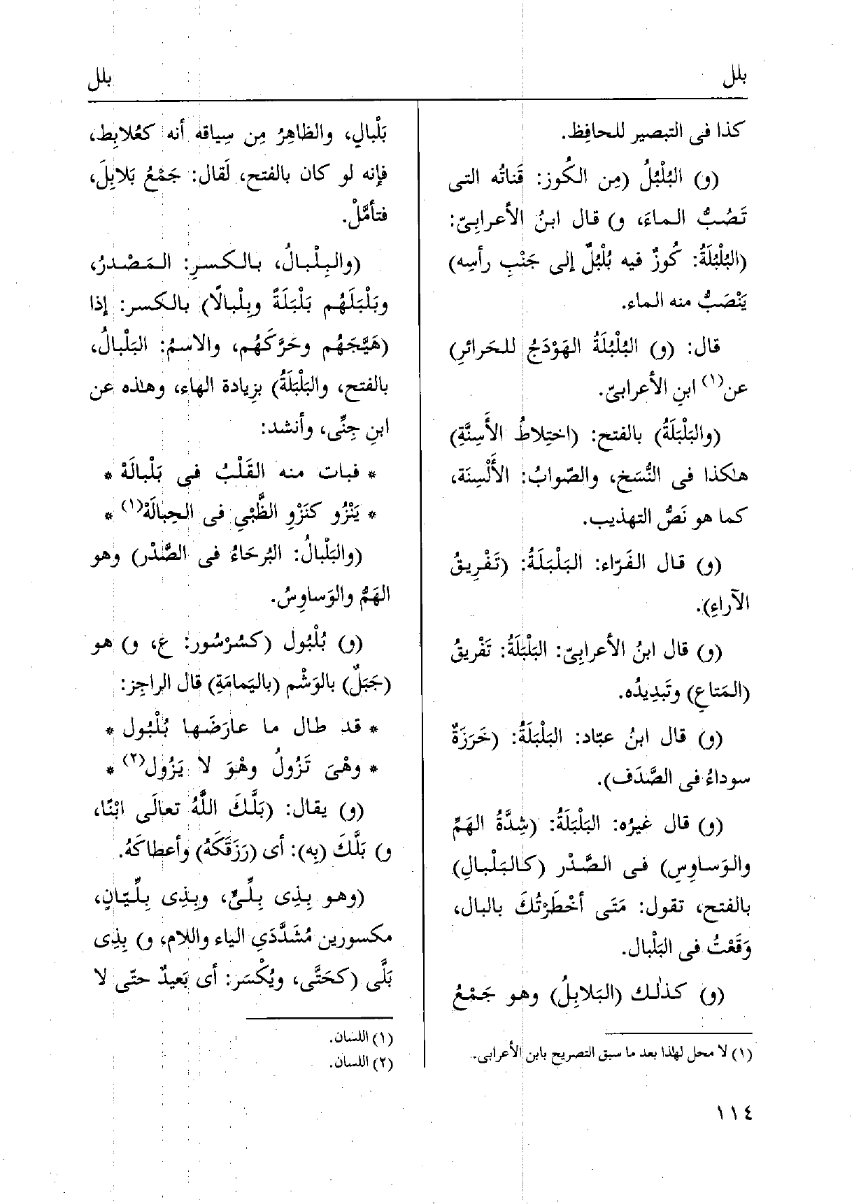 كَذَا فِي التبصير للحافِظ. {والبُلْبُلُ مِن الكُوز: قَناتُه الَّتِي تَصُبُّ الماءَ، قَالَ ابنُ الأعرابِيّ: البُلْبُلَةُ: كُوزٌ فِيهِ بُلْبُلٌ إِلَى جَنْبِ رأسِه يَنْصَبُّ مِنْهُ المَاء. قَالَ: (و) } البُلْبُلَةُ الهَوْدَجُ للحَرائرِ عَن ابنِ الأعرابيّ. {والبَلْبَلَةُ بِالْفَتْح: اختِلاطُ الأَسِنَّةِ هَكَذَا فِي النسَخ، والصّوابُ: الأَلْسِنَة، كَمَا هُوَ نَصُّ التَّهْذِيب. قَالَ الفَرّاء:} البَلْبَلَةُ: تَفْرِيقُ الآراءِ. قَالَ ابنُ الْأَعرَابِي: البَلْبَلَةُ: تَفْريقُ المَتاعِ وتَبدِيدُه. قَالَ ابنُ عبّاد: البَلْبَلَةُ: خَرَزَةٌ سوداءُ فِي الصَّدَف. قَالَ غيرُه: البَلْبَلَةُ: شِدَّةُ الهَمِّ والوَساوِسِ فِي الصَّدْر {كالبَلْبالِ بِالْفَتْح، تَقول: مَتَى أخْطَرتُكَ بالبال، وَقَعْتُ فِي} البَلْبال. كَذَلِك {البَلابِلُ وَهُوَ جَمْعُ بَلْبالٍ، والظاهِرُ مِن سِياقه أَنه كعُلابِط، فَإِنَّهُ لَو كَانَ بِالْفَتْح، لَقال: جَمْعُ} بَلابِلَ، فتأمَّلْ. {والبِلْبالُ، بالكسرِ: المَصْدرُ،} وبَلْبَلَهُم {بَلْبَلَةً} وبلْبالاً بِالْكَسْرِ: إِذا هَيَّجَهُم وحَرَّكَهُم، والاسمُ: {البَلْبالُ، بِالْفَتْح،} والبَلْبَلَةُ بزِيادة الْهَاء، وَهَذِه عَن ابنِ جِنِّي، وَأنْشد: فَبَاتَ مِنْهُ القَلْبُ فِي {بَلْبالَهْ يَنْزُو كنَزْوِ الظَّبيِ فِي الحِبالَهْ} والبَلْبالُ: البُرحَاءُ فِي الصَّدْر وَهُوَ الهَمُّ والوَساوِسُ. (و) {بُلْبُول كسُرسُور: ع، هُوَ جَبَلٌ بالوَشْم باليَمامَةِ قَالَ الراجِز: قد طَال مَا عارَضَها بُلْبُول وَهِي تَزُولُ وهْوَ لَا يَزُول يُقَال:} بَلَّكَ اللَّهُ تعالَى ابْناً، بَلَّكَ بِه: أَي رَزَقَكَهُ وأعطاكَهُ. وَهُوَ بِذِي بِلِّيٍّ، وبذِي بِلِّيّانٍ، مكسورين مُشَدَّدَيِ الْيَاء وَاللَّام، بِذِي! بَلَّى كحَتَّى، ويُكْسَر: أَي بَعيدٌ حتّى لَا