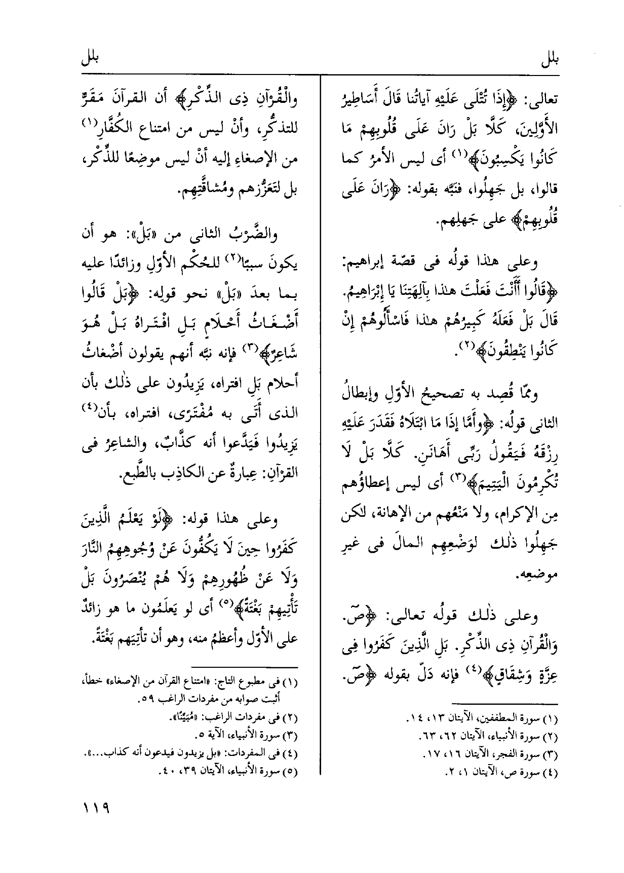 تَعَالَى: إِذَا تُتْلَى عَلَيهِ آياتُنا قَالَ أَسَاطِيرُ الأَوَّلينَ، كَلاَّ بَلْ رَانَ عَلَى قُلُوبهِم مَا كَانُوا يَكْسِبُونَ أَي لَيْسَ الأمرُ كَمَا قَالُوا، بل جَهِلُوا، فنَبَّه بقوله: رَانَ عَلَى قُلُوبهِم على جَهلِهم. وعَلى هَذَا قولُه فِي قصّة إِبْرَاهِيم: قَالُوا أَأَنتَ فَعَلْتَ هَذَا بِآلِهَتِنَا يَا إِبْرَاهِيمُ. قَالَ بَلْ فَعَلَهُ كَبِيرُهُم هَذَا فَاسْأَلُوهُم إِنْ كَانُوا يَنْطِقُونَ. وممّا قُصِد بِهِ تصحيحُ الأوّلِ وإبطالُ الثَّانِي قولُه: وأَمَّا إذَا مَا ابْتَلَاهُ فَقَدَرَ عليهِ رِزْقَهُ فَيَقُولُ رَبِّي أَهَانَنِ. كَلَّا بَلْ لَا تُكْرِمُونَ الْيَتِيمَ أَي لَيْسَ إعطاؤُهم مِن الْإِكْرَام، وَلَا مَنْعُهم من الإهانة، لَكِن جَهِلُوا ذَلِك لوَضْعِهِم المالَ فِي غيرِ موضعِه. وعَلى ذَلِك قولُه تَعَالَى: ص. وَالْقُرآنِ ذِي الذِّكْرِ. بَلِ الَّذِينَ كَفَرُوا فِي عِزَّةٍ وَشِقَاقٍ فَإِنَّهُ دَلّ بقوله ص. والْقُرآنِ ذِي الذِّكْرِ أَن القرآنَ مَقَرٌّ للتذكُّرِ، وأنْ لَيْسَ من امْتنَاع الكُفَّارِ من الإصغاءِ إِلَيْهِ أنْ لَيْسَ موضِعاً للذِّكْر، بل لتَعَزُّزهم ومُشاقَّتِهم. والضَّربُ الثَّانِي من بَلْ: هُوَ أَن يكونَ سَببا للحُكْم الأوّلِ وزائداً عَلَيْهِ بِمَا بعدَ بَلْ نَحْو قولِه: بَلْ قَالُوا أَضْغَاثُ أَحْلَامٍ بَلِ افْتَراهُ بَلْ هُوَ شَاعِرٌ فَإِنَّهُ نبَّه أَنهم يَقُولُونَ أضْغاثُ أَحْلَام بَلِ افتراه، يَزِيدُون على ذَلِك بِأَن الَّذِي أَتَى بِهِ مُفْتَرًى، افتراه، بِأَن يَزِيدُوا فَيَدَّعوا أَنه كذَّابٌ، والشاعِرُ فِي القرآنِ: عِبارةٌ عَن الكاذِب بالطَّبع. وعَلى هَذَا قَوْله: لَوْ يَعْلَمُ الَّذِينَ كَفَرُوا حِينَ لَا يَكُفُّونَ عَنْ وُجُوهِهِمُ النَّارَ وَلَا عَنْ ظُهُورِهِمْ وَلَا هُم يُنْصَرُونَ بَلْ تَأْتِيهِم بَغْتَةً أَي لَو يَعلَمُون مَا هُوَ زائدٌ على الأوّل وأعظمُ مِنْهُ، وَهُوَ أَن تأتِيَهم بَغْتَةً.