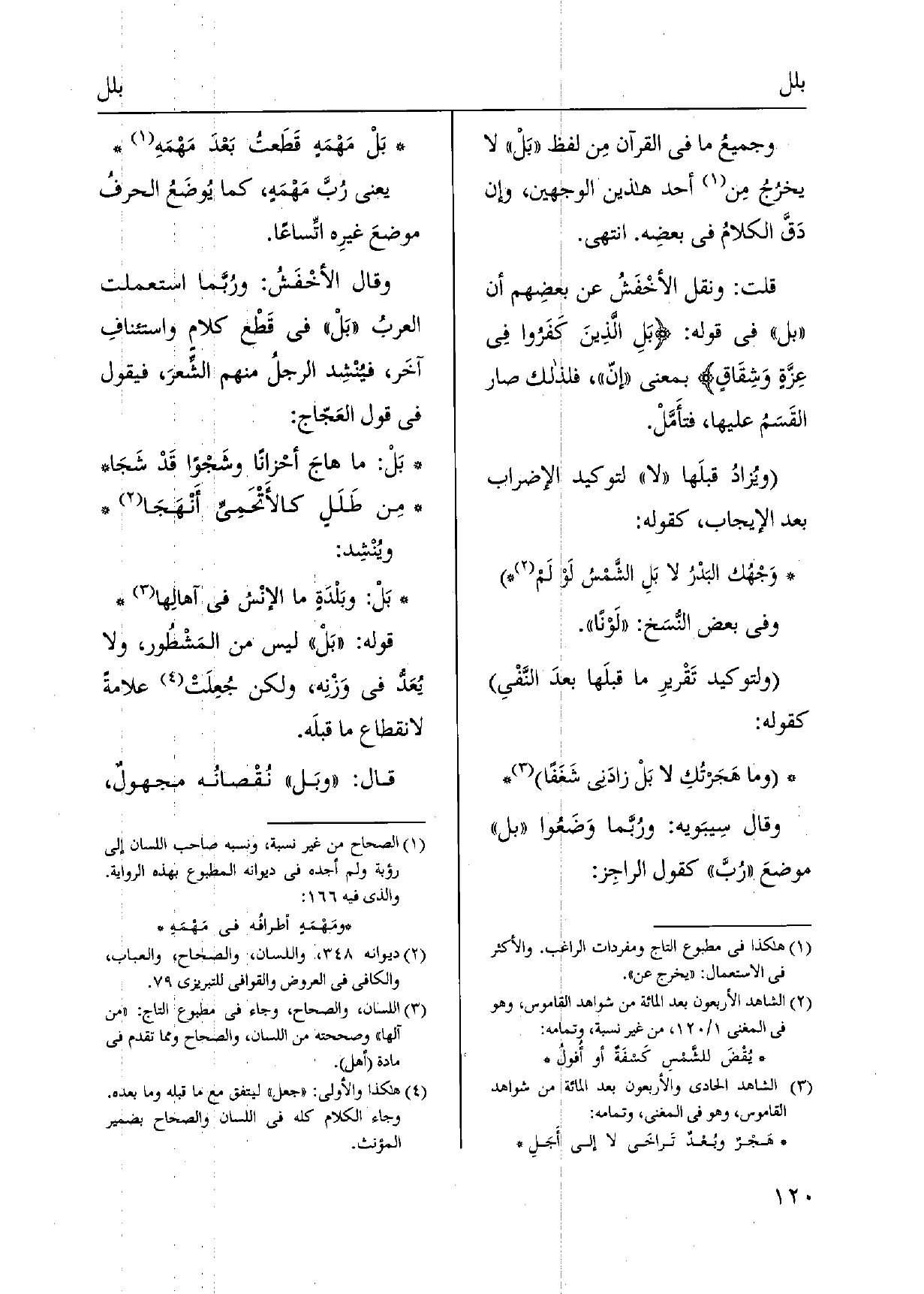 وجميعُ مَا فِي الْقُرْآن مِن لفظ بَلْ لَا يخرُجُ مِن أحد هذَيْن الْوَجْهَيْنِ، وَإِن دَقَّ الكلامُ فِي بعضِه. انْتهى. قلت: وَنقل الأخْفَشُ عَن بعضِهم أَن بل فِي قَوْله: بَلِ الَّذِينَ كَفَرُوا فِي عِزَّةٍ وَشِقَاقٍ بِمَعْنى إنّ، فَلذَلِك صَار القَسَمُ عَلَيْهَا، فتأَمَّلْ. ويُزادُ قبلَها لَا لتوكيد الإضراب بعد الْإِيجَاب، كَقَوْلِه:) وَجْهُك البَدْرُ لَا بَلِ الشَّمْسُ لَوْ لَمْ وَفِي بعض النّسَخ: لَوْناً. ولتوكيد تَقْريرِ مَا قبلَها بعدَ النَّفْيِ كَقَوْلِه: وَمَا هَجَرْتُكِ لَا بَلْ زادَني شَغَفاً وَقَالَ سِيبَويه: ورُبَّما وَضَعُوا بل موضعَ رُبَّ كَقَوْل الراجِز: بَلْ مَهْمَهٍ قَطَعتُ بَعْدَ مَهْمَهِ يعْنى رُبَّ مَهْمَهٍ، كَمَا يُوضَعُ الحرفُ موضعَ غيرِه اتِّساعاً. وَقَالَ الأخْفَشُ: ورُبَّما اسْتعْملت العربُ بَلْ فِي قَطْع كلامٍ واستئنافِ آخَر، فيُنْشِد الرجلُ مِنْهُم الشِّعرَ، فَيَقُول فِي قَول العَجّاج: بَلْ: مَا هاجَ أحْزاناً وشَجْواً قَدْ شَجَا مِن طَلَلٍ كالأَتْحَمِيَّ أَنْهَجَا ويُنْشِد: بَلْ: وبَلْدَةٍ مَا الإنْسُ فِي آهالِها قَوْله: بَلْ لَيْسَ من المَشْطُور، وَلَا يُعَدّ فِي وَزْنِه، وَلَكِن جُعِلَتْ عَلامَة لانْقِطَاع مَا قبلَه. قَالَ:! وبَل نُقْصانُه مجهولٌ،