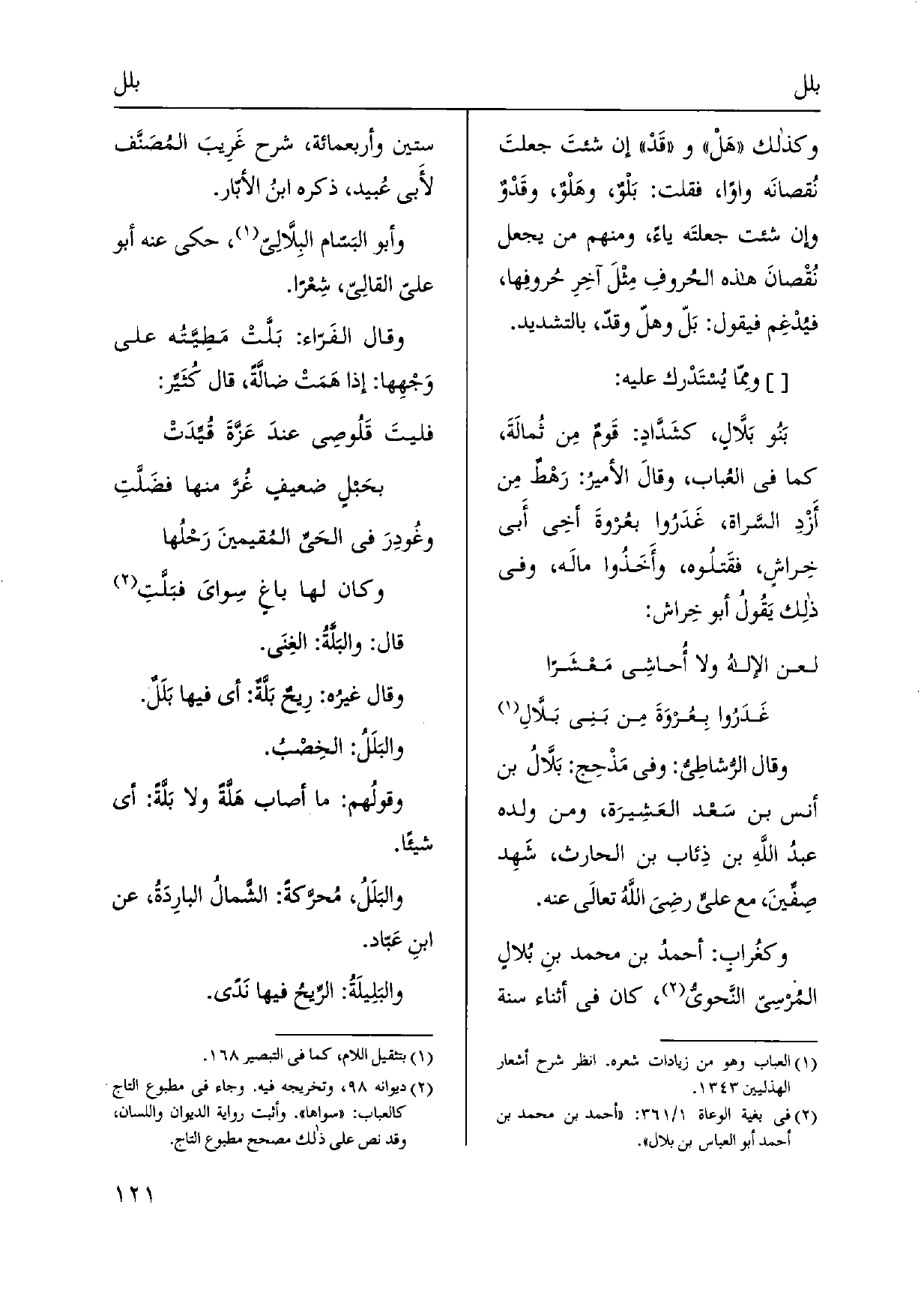 وَقَالَ الرُّشاطِيُّ: وَفِي مَذْحِج: بَلَّالُ بن أنس بن سَعْد العَشِيرَة، وَمن وَلَده عبدُ اللَّهِ بن ذِئاب بن الْحَارِث، شَهِد صِفِّينَ، مَعَ عَليّ رَضِي اللَّهُ تعالَى عَنهُ. وكغُرابٍ: أحمدُ بن مُحَمَّد بنِ} بُلالٍ المُرْسِيّ النَّحويُّ، كَانَ فِي أثْنَاء سنة سِتِّينَ وَأَرْبَعمِائَة، شرح غَرِيبَ المُصَنَّف لأبي عُبيد، ذكره ابنُ الأبّار. وَأَبُو البَسّام {- البِلَّالِيّ، حكى عَنهُ أَبُو عَليّ القالِيّ، شِعْراً. وَقَالَ الفَرّاء:} بَلَّتْ مَطِيَّته على وَجْهِها: إِذا هَمَتْ ضالَّةً، قَالَ كُثَيِّر: